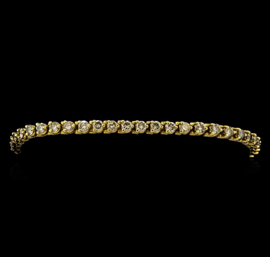 One electronically tested 14KT yellow gold ladies cast & assembled diamond tennis bracelet. Seven inch wearable length bracelet composed of a flexible ribbon of diamonds, terminating in a concealed clasp with safety chain. Identified with markings of '14K'. Condition is good. Bright polish finish. Tennis bracelets & necklaces got their unusual name from an incident involving the U.S. professional tennis player Chris Evert during a tennis match in the 1980's. Evert had been wearing an expensive diamond bracelet, an inline string of individually-set diamonds. Previously these bracelets were known as eternity bracelets. When the clasp snapped during play, she asked the officials to stop the tennis match until the bracelet could be found. Since that day, bracelets and necklaces featuring an inline string of diamonds have been called tennis bracelets and tennis necklaces. Containing: Forty-Five prong set round brilliant cut diamonds, measuring 3.10 - 3.00 x 1.83mm (depth est.) approximate total weight of 45 Stones = 4.70ct. Brown secondary color throughout. Graded in the setting. Clarity SI-1 to I-1. Color: H - J. Total Weight of Diamonds 4.70ct.. Total Weight of Bracelet 13.24gm. AIG Appraised at $15,055.00.