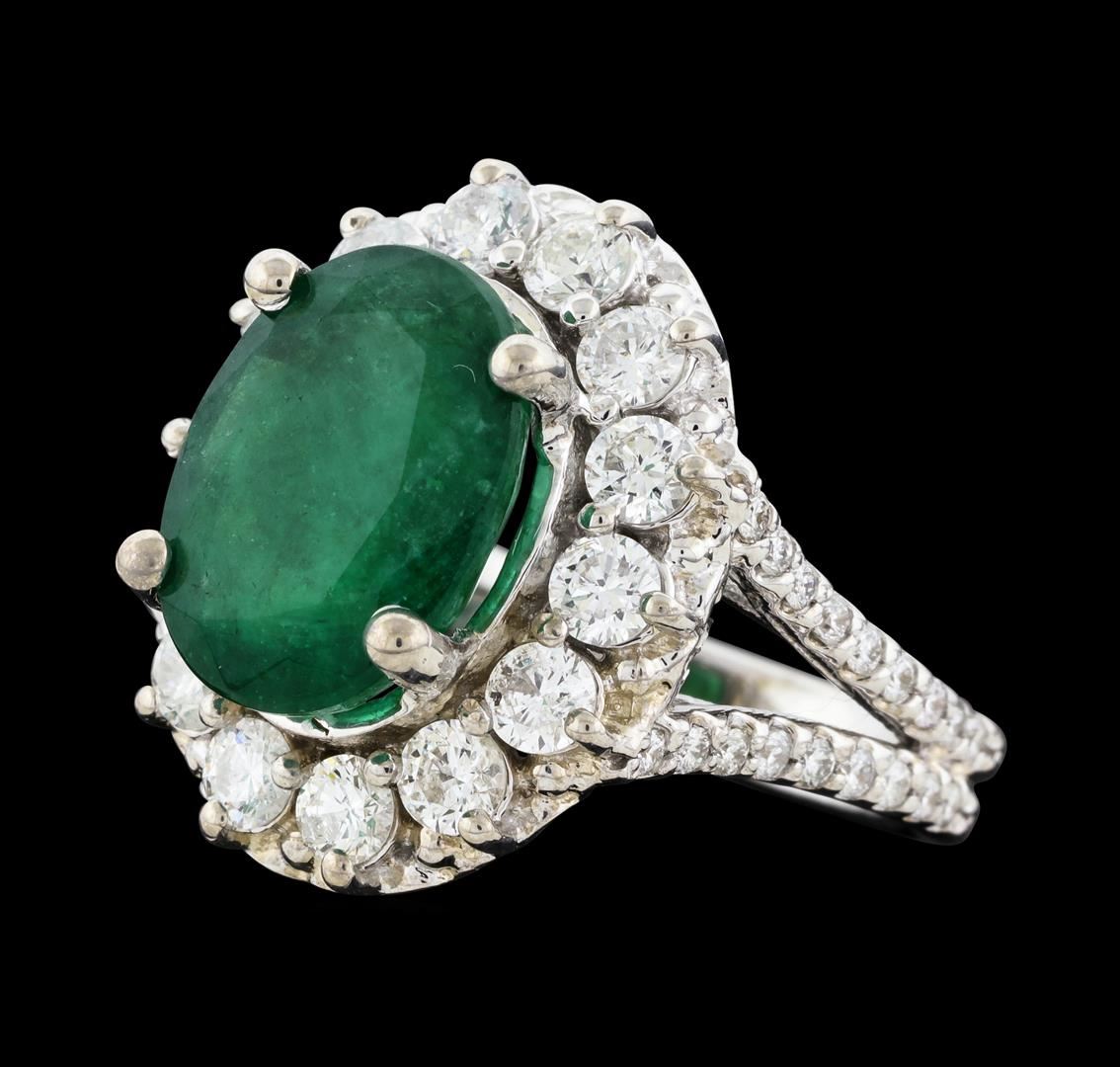 One electronically tested 14KT white gold lady's cast fashion ring with a split shank basket halo with a bright polish finish. The featured lady's ring has a double shank measuring 3.41 millimeters wide. Identified with markings of '14K'. Condition is new, good workmanship. Containing: One prong set oval modified mixed cut natural emerald, measuring 12.78 x 9.50 x 5.47mm, (depth est.) 15%. bulge factor, approximate weight of 4.70ct., clarity is heavily included, medium dark, moderately strong, green color, (GIA G 6/4), cut is good. Transmitting light somewhat diffusely, semi-transparent to translucent. Naturally occurring internal & external characteristics are present. Indications of oil residue. Colored gemstones are presumed to have been subjected to commonly used enhancement processes. Graded in the setting. Fourteen prong set round brilliant cut diamonds, measuring 3.00 - 2.90 x 1.83mm (depth est.) approximate total weight of 14 Stones = 1.35ct. Graded in the setting. Clarity SI-1 to I-1. Color: G - H Cut Good Thirty-Six prong set round brilliant cut diamonds, measuring 1.40 - 1.35 x 0.86mm (depth est.) approximate total weight of 36 Stones = 0.36ct. Graded in the setting. Clarity SI-1 to I-1. Color: G - H Cut Good. Total Weight of Colored Stones 4.70ct.. Total Weight of Diamonds 1.71ct.. Total Weight of Ring 9.10gm. GAS Appraised at $8,400.00.