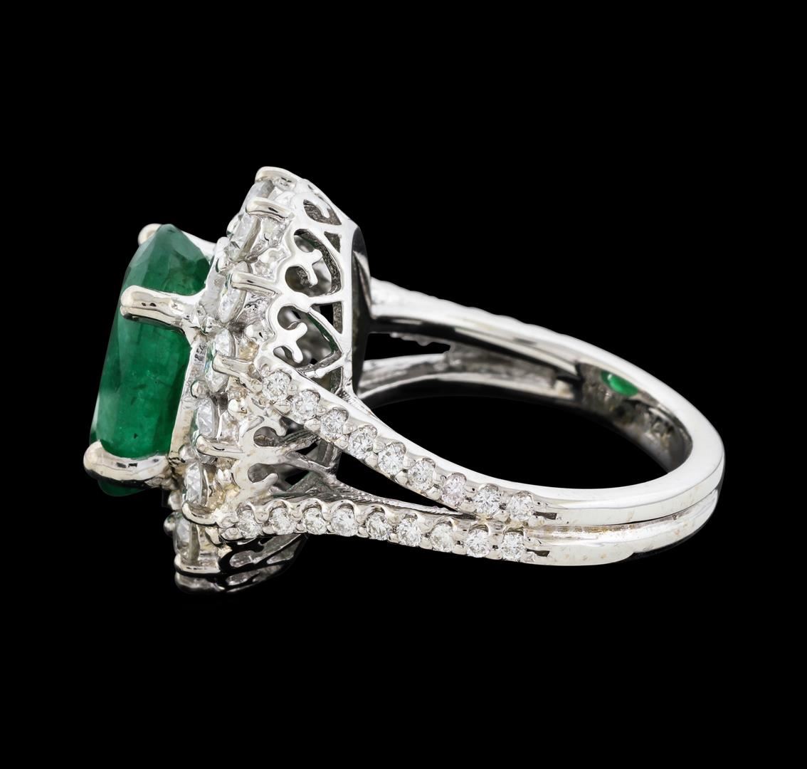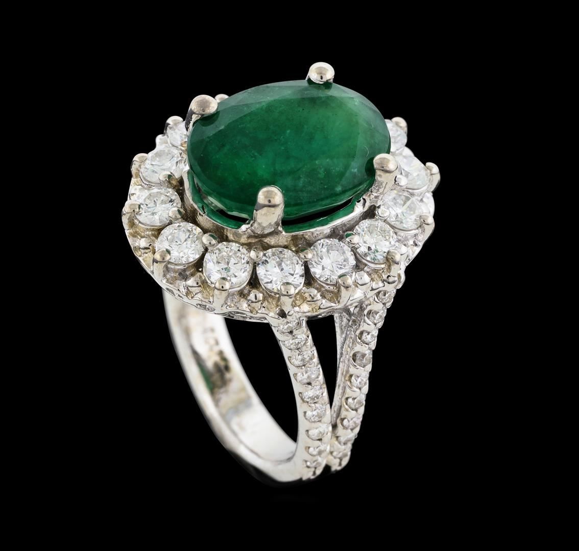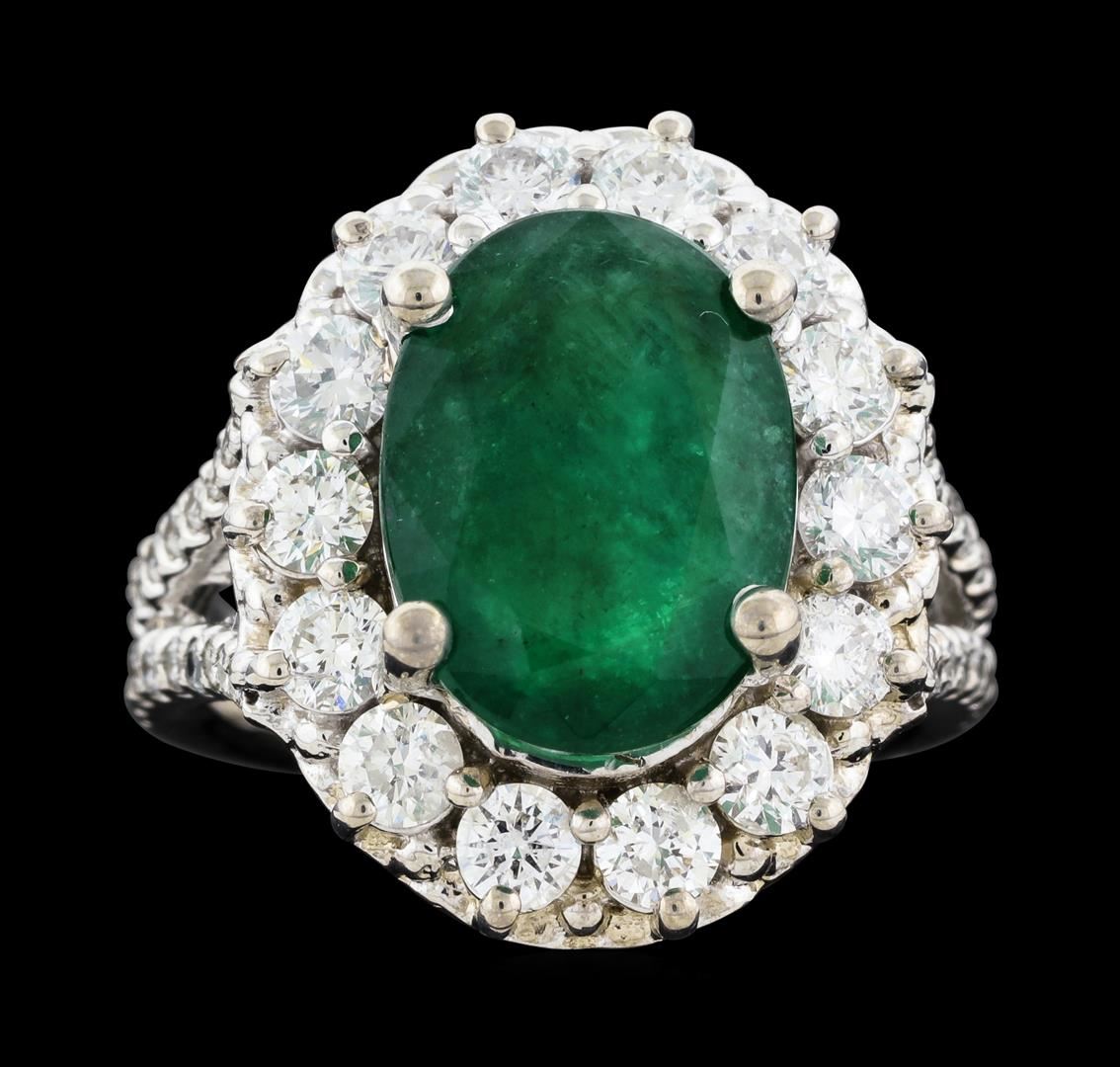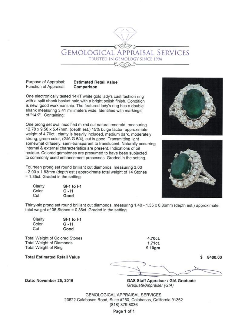 One electronically tested 14KT white gold lady's cast fashion ring with a split shank basket halo with a bright polish finish. The featured lady's ring has a double shank measuring 3.41 millimeters wide. Identified with markings of '14K'. Condition is new, good workmanship. Containing: One prong set oval modified mixed cut natural emerald, measuring 12.78 x 9.50 x 5.47mm, (depth est.) 15%. bulge factor, approximate weight of 4.70ct., clarity is heavily included, medium dark, moderately strong, green color, (GIA G 6/4), cut is good. Transmitting light somewhat diffusely, semi-transparent to translucent. Naturally occurring internal & external characteristics are present. Indications of oil residue. Colored gemstones are presumed to have been subjected to commonly used enhancement processes. Graded in the setting. Fourteen prong set round brilliant cut diamonds, measuring 3.00 - 2.90 x 1.83mm (depth est.) approximate total weight of 14 Stones = 1.35ct. Graded in the setting. Clarity SI-1 to I-1. Color: G - H Cut Good Thirty-Six prong set round brilliant cut diamonds, measuring 1.40 - 1.35 x 0.86mm (depth est.) approximate total weight of 36 Stones = 0.36ct. Graded in the setting. Clarity SI-1 to I-1. Color: G - H Cut Good. Total Weight of Colored Stones 4.70ct.. Total Weight of Diamonds 1.71ct.. Total Weight of Ring 9.10gm. GAS Appraised at $8,400.00.