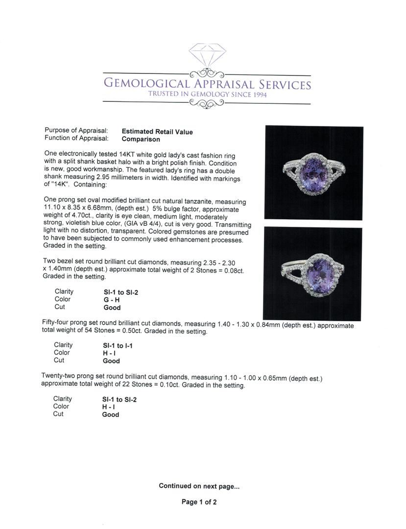 One electronically tested 14KT white gold lady's cast fashion ring with a split shank basket halo with a bright polish finish. The featured lady's ring has a double shank measuring 2.95 millimeters in width. Identified with markings of '14K'. Condition is new, good workmanship. Containing: One prong set oval modified brilliant cut natural tanzanite, measuring 11.10 x 8.35 x 6.68mm, (depth est.) 5%. bulge factor, approximate weight of 4.70ct., clarity is eye clean, medium light, moderately strong, violetish blue color, (GIA vB 4/4), cut is very good. Transmitting light with no distortion, transparent. Colored gemstones are presumed to have been subjected to commonly used enhancement processes. Graded in the setting. Two bezel set round brilliant cut diamonds, measuring 2.35 - 2.30 x 1.40mm (depth est.) approximate total weight of 2 Stones = 0.08ct. Graded in the setting. Clarity SI-1 to SI-2. Color: G - H Cut Good Fifty-Four prong set round brilliant cut diamonds, measuring 1.40 - 1.30 x 0.84mm (depth est.) approximate total weight of 54 Stones = 0.50ct. Graded in the setting. Clarity SI-1 to I-1. Color: H - I Cut Good Twenty-Two prong set round brilliant cut diamonds, measuring 1.10 - 1.00 x 0.65mm (depth est.) approximate total weight of 22 Stones = 0.10ct. Graded in the setting. Clarity SI-1 to SI-2. Color: H - I Cut Good. Total Weight of Colored Stones 4.70ct.. Total Weight of Diamonds 0.68ct.. Total Weight of Ring 5.50gm. GAS Appraised at $9,190.00.
