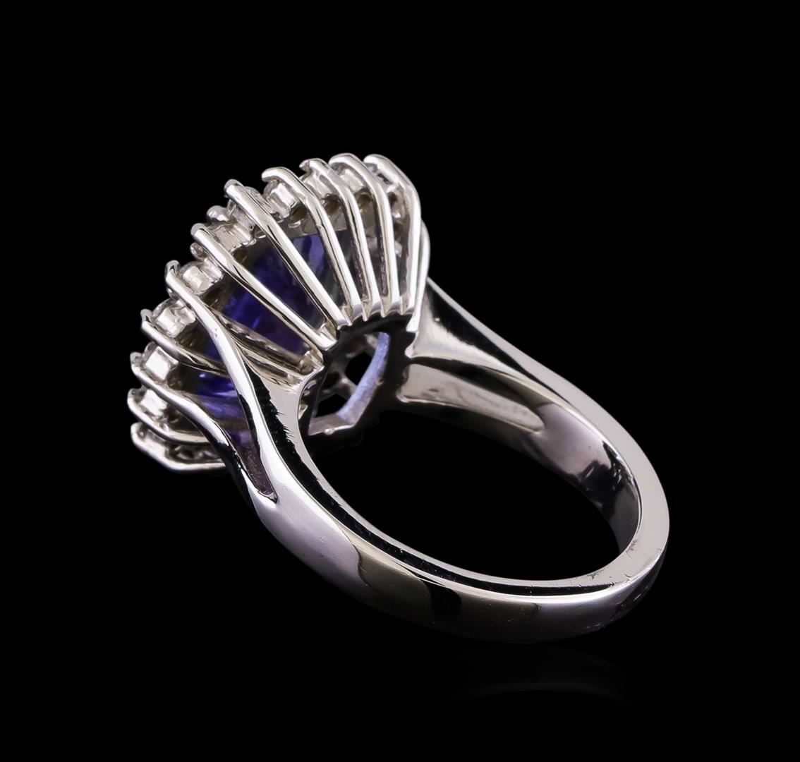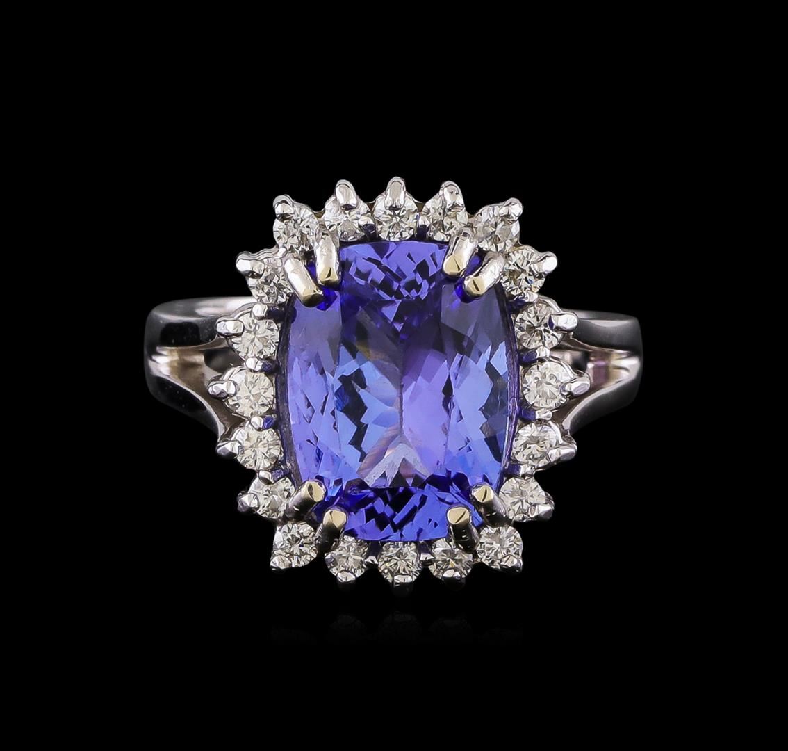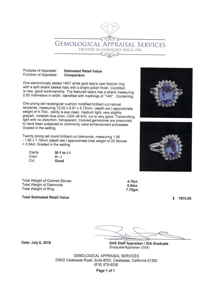 One electronically tested 14KT white gold lady's cast fashion ring with a split shank basket halo with a bright polish finish. The featured lady's has a shank measuring 2.60 millimeters in width. Identified with markings of "14K". Condition is new, good workmanship. Containing: One prong set rectangular cushion modified brilliant cut natural tanzanite, measuring 12.02 x 8.91 x 5.72mm, (depth est.) approximate weight of 4.70ct., clarity is eye clean, medium light, very slightly grayish, violetish blue color, (GIA vB 4/3), cut is very good. Transmitting light with no distortion, transparent. Colored gemstones are presumed to have been subjected to commonly used enhancement processes. Graded in the setting. Twenty prong set round brilliant cut diamonds, measuring 1.95 - 1.90 x 1.19mm (depth est.) approximate total weight of 20 Stones = 0.54ct. Graded in the setting. Clarity: SI-1 to I-1. Color: H - I. Cut Good. Total Weight of Colored Stones 4.70ct. Total Weight of Diamonds 0.54ct. Total Weight of Ring 7.70gm. GAS Appraised.
