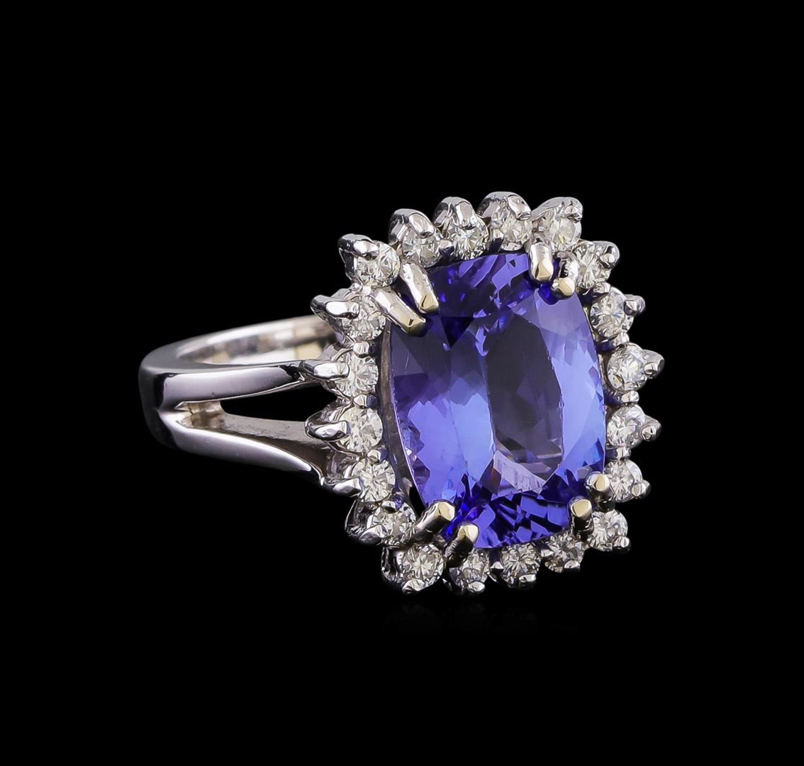 One electronically tested 14KT white gold lady's cast fashion ring with a split shank basket halo with a bright polish finish. The featured lady's has a shank measuring 2.60 millimeters in width. Identified with markings of "14K". Condition is new, good workmanship. Containing: One prong set rectangular cushion modified brilliant cut natural tanzanite, measuring 12.02 x 8.91 x 5.72mm, (depth est.) approximate weight of 4.70ct., clarity is eye clean, medium light, very slightly grayish, violetish blue color, (GIA vB 4/3), cut is very good. Transmitting light with no distortion, transparent. Colored gemstones are presumed to have been subjected to commonly used enhancement processes. Graded in the setting. Twenty prong set round brilliant cut diamonds, measuring 1.95 - 1.90 x 1.19mm (depth est.) approximate total weight of 20 Stones = 0.54ct. Graded in the setting. Clarity: SI-1 to I-1. Color: H - I. Cut Good. Total Weight of Colored Stones 4.70ct. Total Weight of Diamonds 0.54ct. Total Weight of Ring 7.70gm. GAS Appraised.