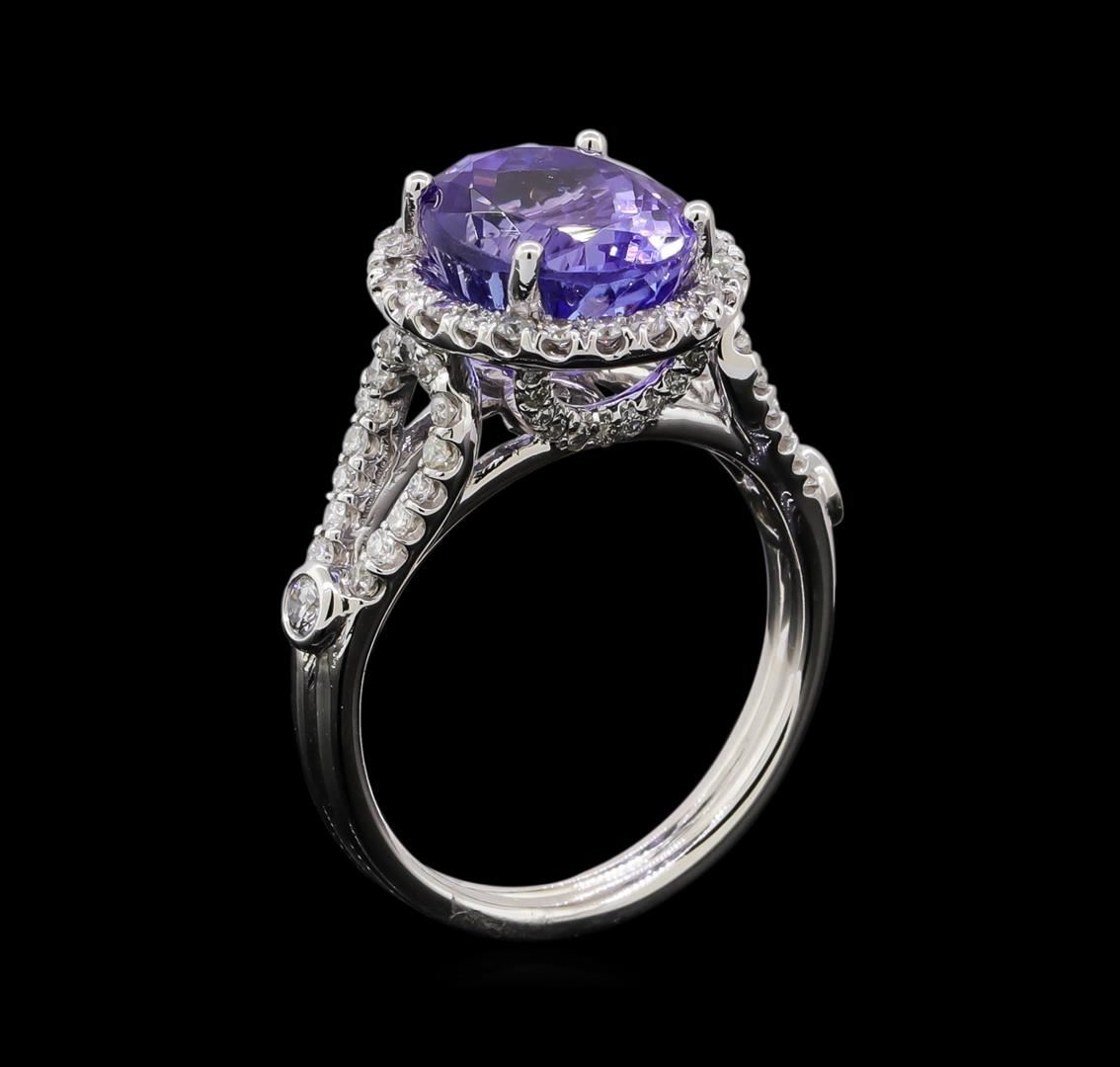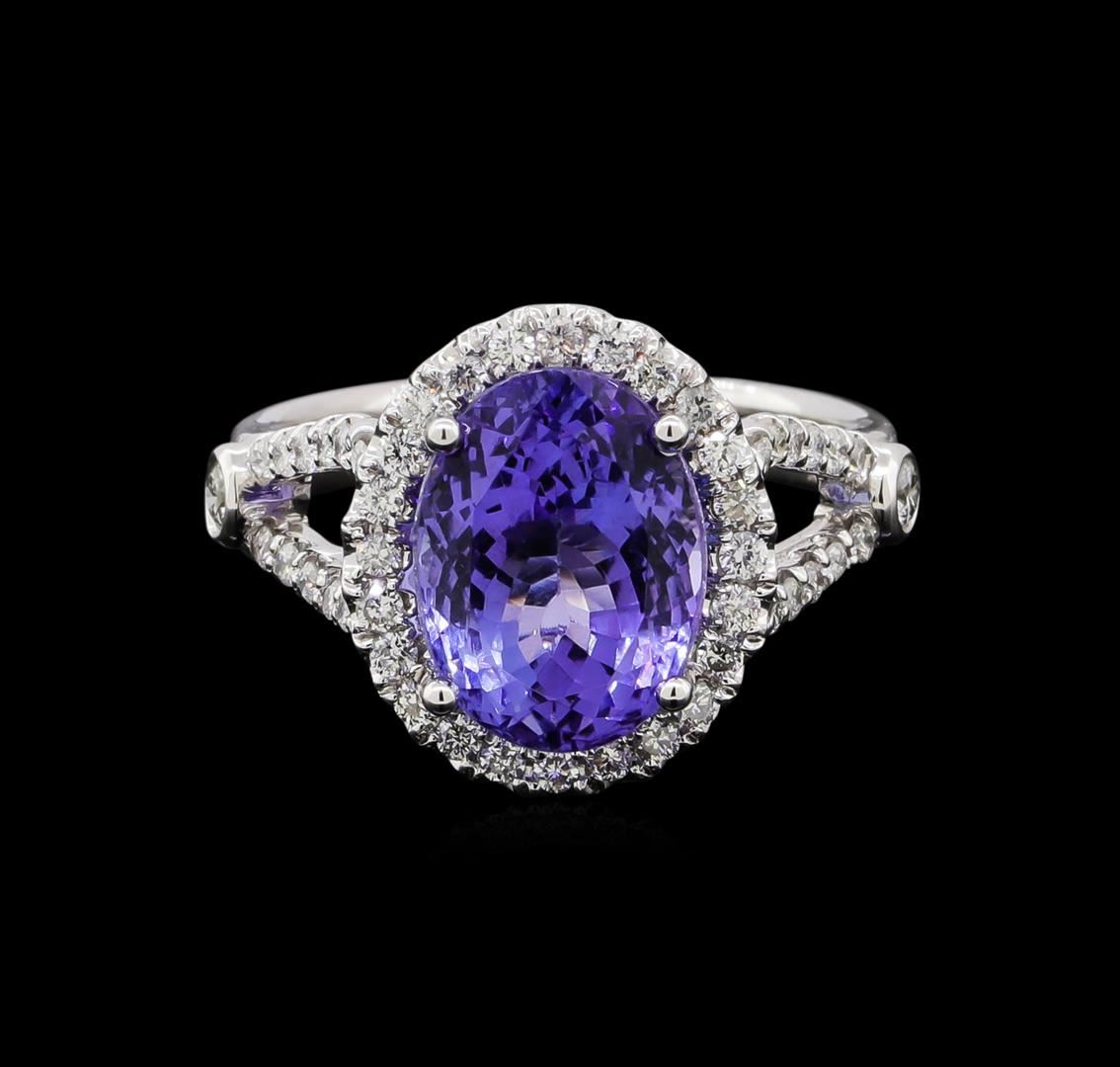 One electronically tested 14KT white gold lady's cast fashion ring with a split shank basket halo with a bright polish finish. The featured lady's ring has a double shank measuring 2.95 millimeters in width. Identified with markings of '14K'. Condition is new, good workmanship. Containing: One prong set oval modified brilliant cut natural tanzanite, measuring 11.10 x 8.35 x 6.68mm, (depth est.) 5%. bulge factor, approximate weight of 4.70ct., clarity is eye clean, medium light, moderately strong, violetish blue color, (GIA vB 4/4), cut is very good. Transmitting light with no distortion, transparent. Colored gemstones are presumed to have been subjected to commonly used enhancement processes. Graded in the setting. Two bezel set round brilliant cut diamonds, measuring 2.35 - 2.30 x 1.40mm (depth est.) approximate total weight of 2 Stones = 0.08ct. Graded in the setting. Clarity SI-1 to SI-2. Color: G - H Cut Good Fifty-Four prong set round brilliant cut diamonds, measuring 1.40 - 1.30 x 0.84mm (depth est.) approximate total weight of 54 Stones = 0.50ct. Graded in the setting. Clarity SI-1 to I-1. Color: H - I Cut Good Twenty-Two prong set round brilliant cut diamonds, measuring 1.10 - 1.00 x 0.65mm (depth est.) approximate total weight of 22 Stones = 0.10ct. Graded in the setting. Clarity SI-1 to SI-2. Color: H - I Cut Good. Total Weight of Colored Stones 4.70ct.. Total Weight of Diamonds 0.68ct.. Total Weight of Ring 5.50gm. GAS Appraised at $9,190.00.