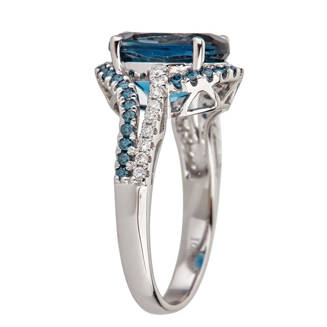 One Ring : 10KT white gold weighing 2.99gm containing one London blue topaz center stone with a total weight of 4.70ct, blue diamonds weighing 0.30ctw, and side diamonds weighing 0.15ctw.