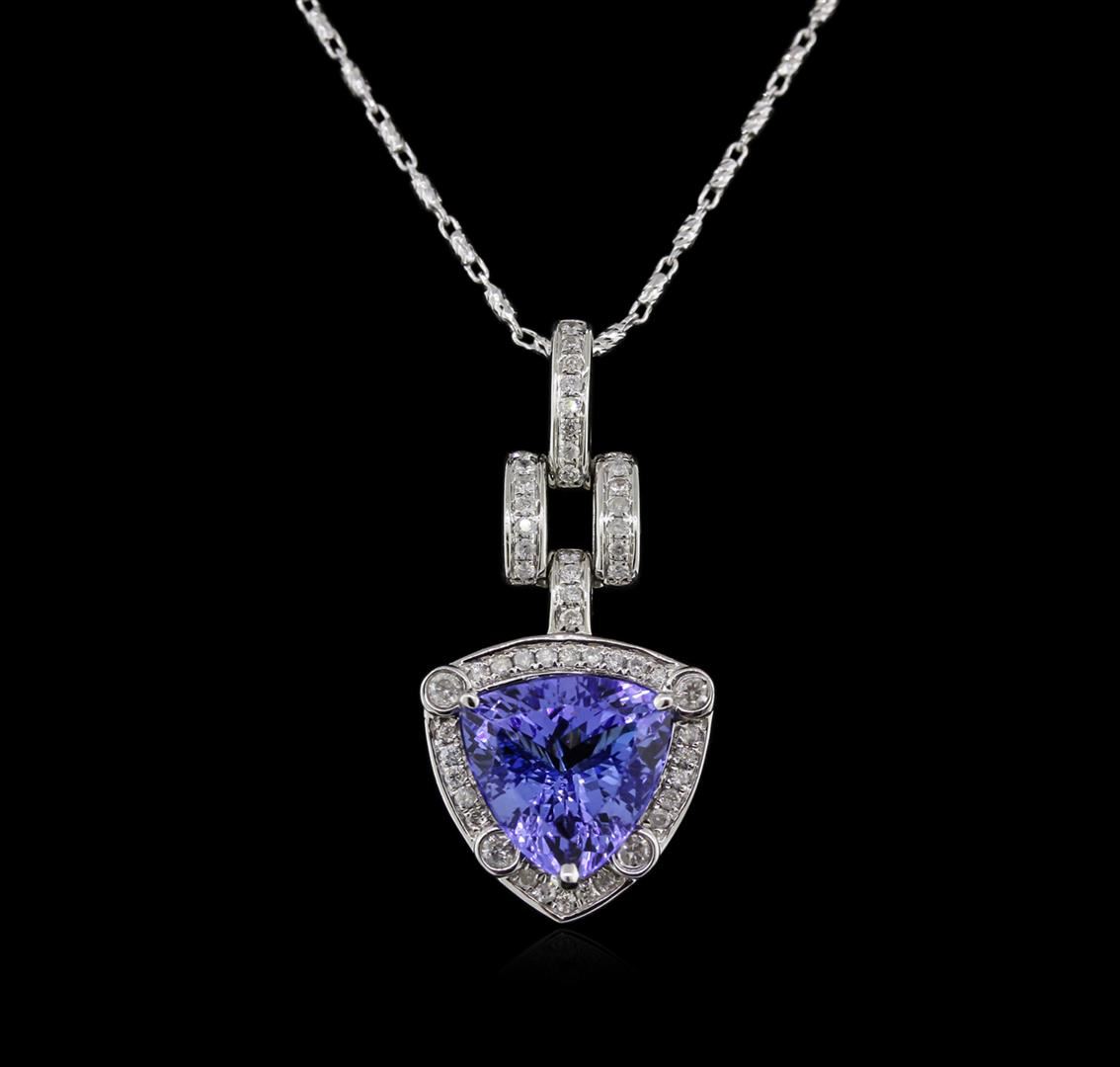 Fourteen karat (14K) white gold tanzanite and diamond pendant. A trillion cut tanzanite zoisite gemstone is prong mounted in the center of the pendant. Round brilliant cut diamonds accent the pendant around the center gemstone and on the top bail. The pendant is cast stamped "14K" and has a gross weight of 8.3 Grams. Diamond(s): Shape: Round Brilliant cut. Weight: 0.40 carat. Average Clarity: I1. Average Color: H-J. Symmetry: Very Good. Polish: Very Good. Gemstone(s): Gemstone: Tanzanite Zoisite. Nature: Natural. Shape: Trillion, Faceted. Quantity: 1, Mounted. Weight: 4.71 carat. Dimensions: Length- 10.40 mm. ; Width- 9.79 mm. Bulge: Visible. Clarity: VS, Type 1. Color: Purplish Blue (4/4). Symmetry: Very Good. Color Intensity: Medium. Transparency: Transparent. Tone: Medium. Metal(s): Metal: Gold, Stamped. Purity: 14K. Color: White. Condition: Excellent. Finish: High polish. GGA Appraised at $13,185.00.