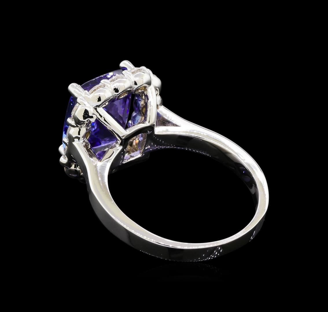 One electronically tested 14KT white gold lady's cast fashion ring with a basket halo with a bright polish finish. The featured lady's ring has a shank measuring 2.26 millimeters wide. Identified with markings of "14K". Condition is new, good workmanship. Containing: One prong set rectangular cushion modified brilliant cut natural tanzanite, measuring 10.15 x 8.80 x 6.38mm, approximate weight of 4.71ct., clarity is eye clean, type I, medium dark, moderately strong, violetish blue color, (GIA vB 6/4), cut is very good. Transmitting light with no distortion, transparent. Colored gemstones are presumed to have been subjected to commonly used enhancement processes. Graded in the setting. Fourteen prong set round brilliant cut diamonds, measuring 2.60 - 2.50 x 1.58mm (depth est.) approximate total weight of 14 Stones = 0.88ct. Graded in the setting. Clarity: SI-1 to SI-2. Color: H - I. Cut Very Good. Total Weight of Colored Stones 4.71ct. Total Weight of Diamonds 0.88ct. Total Weight of Ring 6.30gm. GAS Appraised at $11,110.00.
