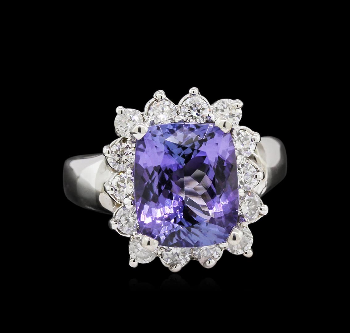 One electronically tested 14KT white gold lady's cast fashion ring with a basket halo with a bright polish finish. The featured lady's ring has a shank measuring 3.39 millimeters wide. Condition is new, good workmanship. Containing: One prong set rectangular cushion modified brilliant cut natural tanzanite, measuring 10.85 x 9.00 x 5.85mm, 5%. bulge factor, approximate weight of 4.71ct., clarity is eye clean, type I, medium, very slightly grayish, bluish violet color, (GIA bV 5/3), cut is very good. Transmitting light with no distortion, transparent. Colored gemstones are presumed to have been subjected to commonly used enhancement processes. Graded in the setting. Fourteen prong set round brilliant cut diamonds, measuring 2.60 - 2.50 x 1.61mm (depth est.) approximate total weight of 14 Stones = 0.92ct. Graded in the setting. Clarity: SI-1 to SI-2. Color: H - I. Cut Very Good. Total Weight of Colored Stones 4.71ct. Total Weight of Diamonds 0.92ct. Total Weight of Ring 8.00gm. GAS Appraised at $10,300.00.
