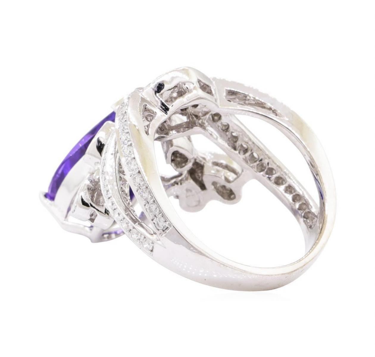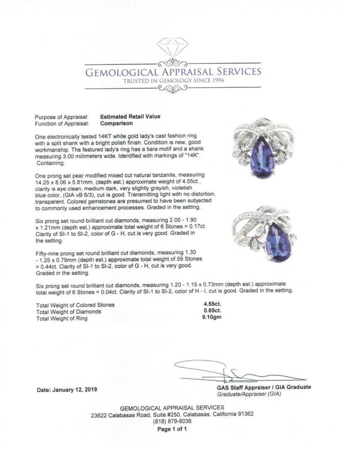 One electronically tested 14KT white gold lady's cast fashion ring with a split shank with a bright polish finish. The featured lady's ring has a tiara motif and a shank measuring 3.00 millimeters wide. Identified with markings of '14K'. Condition is new, good workmanship. Containing: One prong set pear modified mixed cut natural tanzanite, measuring 14.25 x 8.06 x 5.81mm, (depth est.) approximate weight of 4.55ct., clarity is eye clean, medium dark, very slightly grayish, violetish blue color, (GIA vB 6/3), cut is good. Transmitting light with no distortion, transparent. Colored gemstones are presumed to have been subjected to commonly used enhancement processes. Graded in the setting. Six prong set round brilliant cut diamonds, measuring 2.00 - 1.90 x 1.21mm (depth est.) approximate total weight of 6 Stones = 0.17ct. Graded in the setting. Color G - H Clarity SI-1 to SI-2 Cut Very Good Fifty-Nine prong set round brilliant cut diamonds, measuring 1.30 - 1.25 x 0.79mm (depth est.) approximate total weight of 59 Stones = 0.44ct. Graded in the setting. Color G - H Clarity SI-1 to SI-2 Cut Very Good Six prong set round brilliant cut diamonds, measuring 1.20 - 1.15 x 0.73mm (depth est.) approximate total weight of 6 Stones = 0.04ct. Graded in the setting. Color H - I Clarity SI-1 to SI-2 Cut Good. Total Weight of Colored Stones 4.55ct.. Total Weight of Diamonds 0.65ct.. Total Weight of Ring 9.10gm GAS Appraised at $8885.00. GAS Appraised.