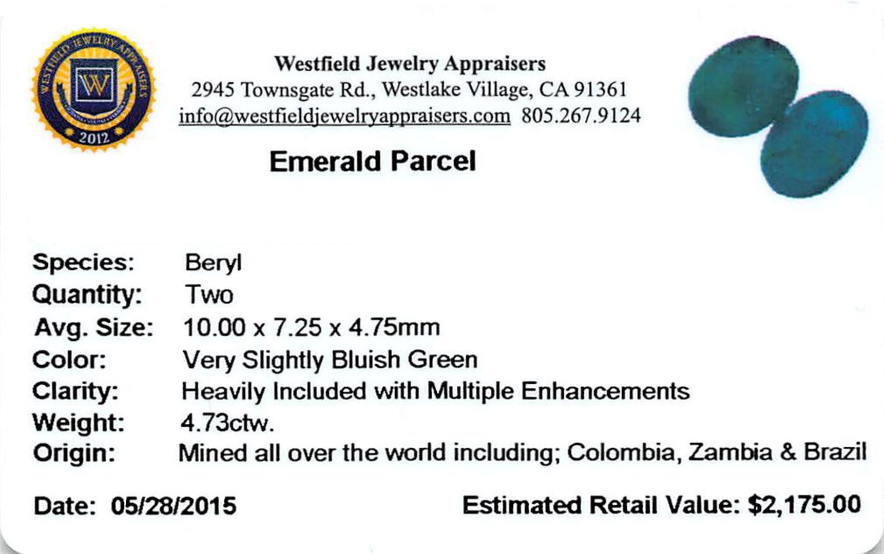 Two oval mixed cut natural emeralds, measuring 10.00 x 7.25 x 4.75mm, exact total weight 4.73ct., clarity is heavily included, type III, medium dark, very slightly grayish, very slightly bluish green color, (GIA vslbG 6/3), cut is good. Transmitting light somewhat diffusely, translucent, Naturally occurring internal & external characteristics are present, Indications of multiple laboratory enhancements, including high temperature heat treatment. Westfield Appraised.
