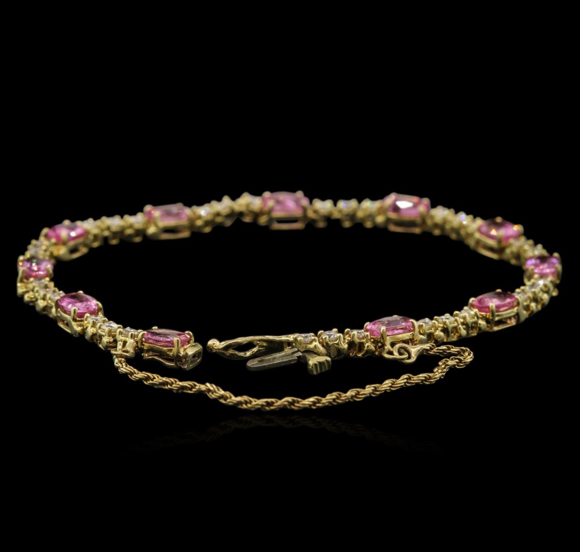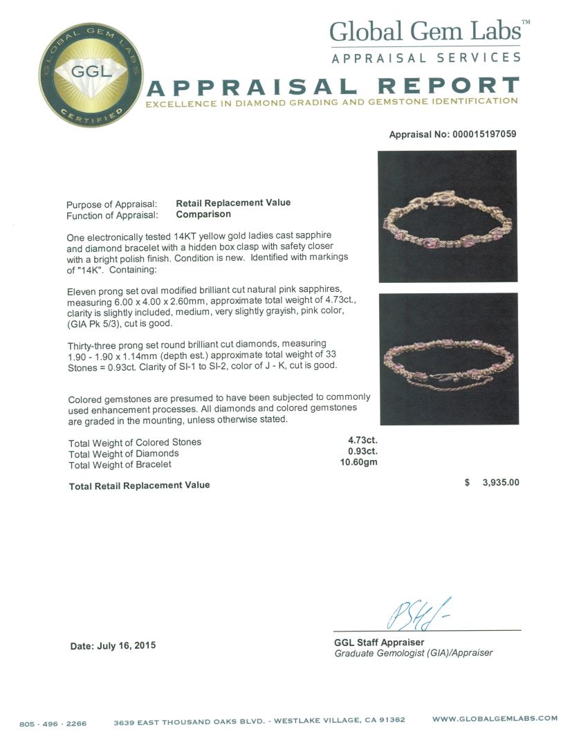 One electronically tested 14KT yellow gold ladies cast sapphire and diamond bracelet with a hidden box clasp with safety closer with a bright polish finish. Identified with markings of "14K". Condition is new. Containing: Eleven prong set oval modified brilliant cut natural pink sapphires, measuring 6.00 x 4.00 x 2.60mm, approximate total weight of 4.73ct., clarity is slightly included, medium, very slightly grayish, pink color, (GIA Pk 5/3), cut is good. Thirty-Three prong set round brilliant cut diamonds, measuring 1.90 - 1.90 x 1.14mm (depth est.) approximate total weight of 33 Stones = 0.93ct. Clarity: SI-1 to SI-2. Color: J - K, Cut is Good. Colored gemstones are presumed to have been subjected to commonly used enhancement processes. All diamonds and colored gemstones are graded in the mounting, unless otherwise stated. Total Weight of Colored Stones 4.73ct. Total Weight of Diamonds 0.93ct. Total Weight of Bracelet 10.60 grams. GGL Appraised at $3,935.00.
