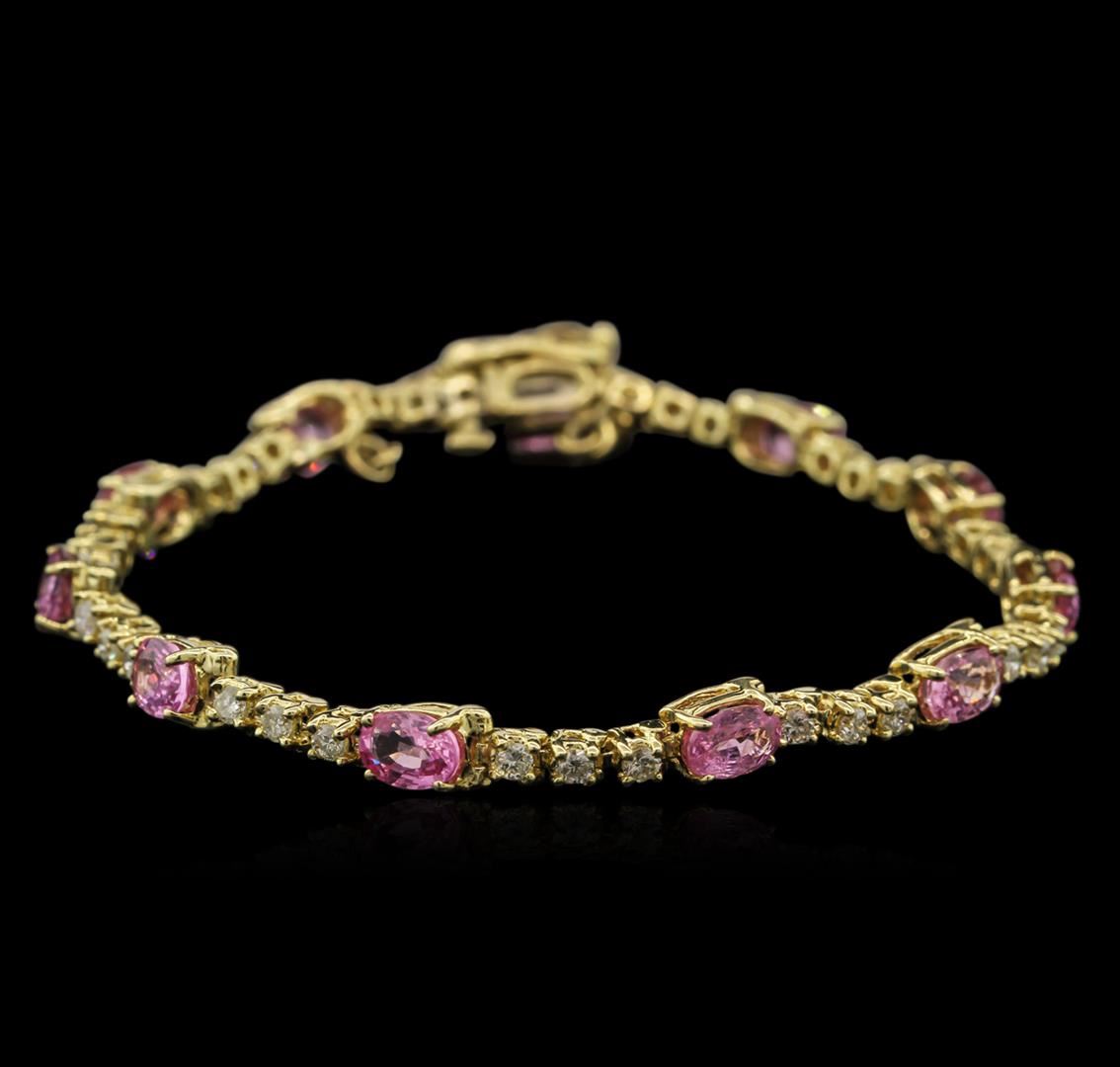 One electronically tested 14KT yellow gold ladies cast sapphire and diamond bracelet with a hidden box clasp with safety closer with a bright polish finish. Identified with markings of "14K". Condition is new. Containing: Eleven prong set oval modified brilliant cut natural pink sapphires, measuring 6.00 x 4.00 x 2.60mm, approximate total weight of 4.73ct., clarity is slightly included, medium, very slightly grayish, pink color, (GIA Pk 5/3), cut is good. Thirty-Three prong set round brilliant cut diamonds, measuring 1.90 - 1.90 x 1.14mm (depth est.) approximate total weight of 33 Stones = 0.93ct. Clarity: SI-1 to SI-2. Color: J - K, Cut is Good. Colored gemstones are presumed to have been subjected to commonly used enhancement processes. All diamonds and colored gemstones are graded in the mounting, unless otherwise stated. Total Weight of Colored Stones 4.73ct. Total Weight of Diamonds 0.93ct. Total Weight of Bracelet 10.60 grams. GGL Appraised at $3,935.00.