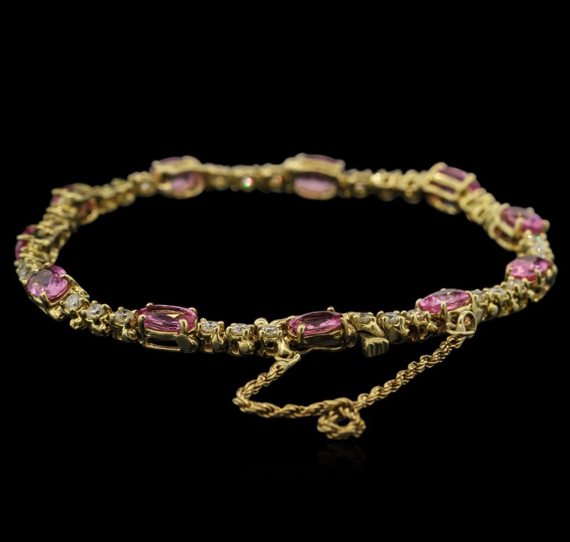 One electronically tested 14KT yellow gold ladies cast sapphire and diamond bracelet with a hidden box clasp with safety closer with a bright polish finish. Identified with markings of "14K". Condition is new. Containing: Eleven prong set oval modified brilliant cut natural pink sapphires, measuring 6.00 x 4.00 x 2.60mm, approximate total weight of 4.73ct., clarity is slightly included, medium, very slightly grayish, pink color, (GIA Pk 5/3), cut is good. Thirty-Three prong set round brilliant cut diamonds, measuring 1.90 - 1.90 x 1.14mm (depth est.) approximate total weight of 33 Stones = 0.93ct. Clarity: SI-1 to SI-2. Color: J - K, Cut is Good. Colored gemstones are presumed to have been subjected to commonly used enhancement processes. All diamonds and colored gemstones are graded in the mounting, unless otherwise stated. Total Weight of Colored Stones 4.73ct. Total Weight of Diamonds 0.93ct. Total Weight of Bracelet 10.60 grams. GGL Appraised at $3,935.00.