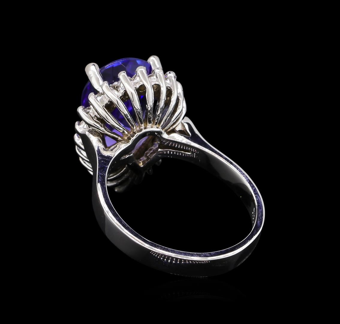 One electronically tested 14KT white gold ladies cast tanzanite and diamond ring with a bright polish finish. The featured tanzanite is set within a diamond bezel supported by a ribbed under gallery, completed by a two and one-half millimeter wide band. Identified with markings of "14K". Condition is new, good workmanship. Containing: One prong set pear mixed cut natural tanzanite, measuring 14.10 x 9.20 x 5.60mm, approximate weight of 4.74ct., clarity is eye clean, type I, medium dark, very slightly grayish, bluish violet color, (GIA bV 6/3), cut is good. Transmitting light with no distortion, transparent. Graded in the setting. Tanzanite is a very rare gemstone that is only found in the country of Tanzania. Originally discovered in 1967. Tiffany & Company, named the stone Tanzanite. It is found in the Usumburu Mountains that border the Umba Valley of northern Tanzania. Tanzanite occurs in gray, brown, violet, blue, reddish-purple, & green. The gem is interesting because of its exceptional pleochroism. Rotated in different directions a tanzanite will exhibit multiple changes of color. Tanzanite has a low tolerance to ultrasonic cleaning, and should not be cleaned using this method. Twenty-Two prong set round brilliant cut diamonds approximate total weight of 22 Stones = 0.45ct. Clarity grade is an average for the group. Graded in the setting. Clarity: SI-1 to I-1. Color: D - F. Total Weight of Colored Stones 4.74ct. Total Weight of Diamonds 0.45ct. Total Weight of Ring 6.45gm. AIG Appraised at $12,870.00.