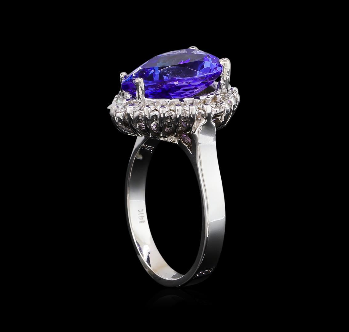 One electronically tested 14KT white gold ladies cast tanzanite and diamond ring with a bright polish finish. The featured tanzanite is set within a diamond bezel supported by a ribbed under gallery, completed by a two and one-half millimeter wide band. Identified with markings of "14K". Condition is new, good workmanship. Containing: One prong set pear mixed cut natural tanzanite, measuring 14.10 x 9.20 x 5.60mm, approximate weight of 4.74ct., clarity is eye clean, type I, medium dark, very slightly grayish, bluish violet color, (GIA bV 6/3), cut is good. Transmitting light with no distortion, transparent. Graded in the setting. Tanzanite is a very rare gemstone that is only found in the country of Tanzania. Originally discovered in 1967. Tiffany & Company, named the stone Tanzanite. It is found in the Usumburu Mountains that border the Umba Valley of northern Tanzania. Tanzanite occurs in gray, brown, violet, blue, reddish-purple, & green. The gem is interesting because of its exceptional pleochroism. Rotated in different directions a tanzanite will exhibit multiple changes of color. Tanzanite has a low tolerance to ultrasonic cleaning, and should not be cleaned using this method. Twenty-Two prong set round brilliant cut diamonds approximate total weight of 22 Stones = 0.45ct. Clarity grade is an average for the group. Graded in the setting. Clarity: SI-1 to I-1. Color: D - F. Total Weight of Colored Stones 4.74ct. Total Weight of Diamonds 0.45ct. Total Weight of Ring 6.45gm. AIG Appraised at $12,870.00.