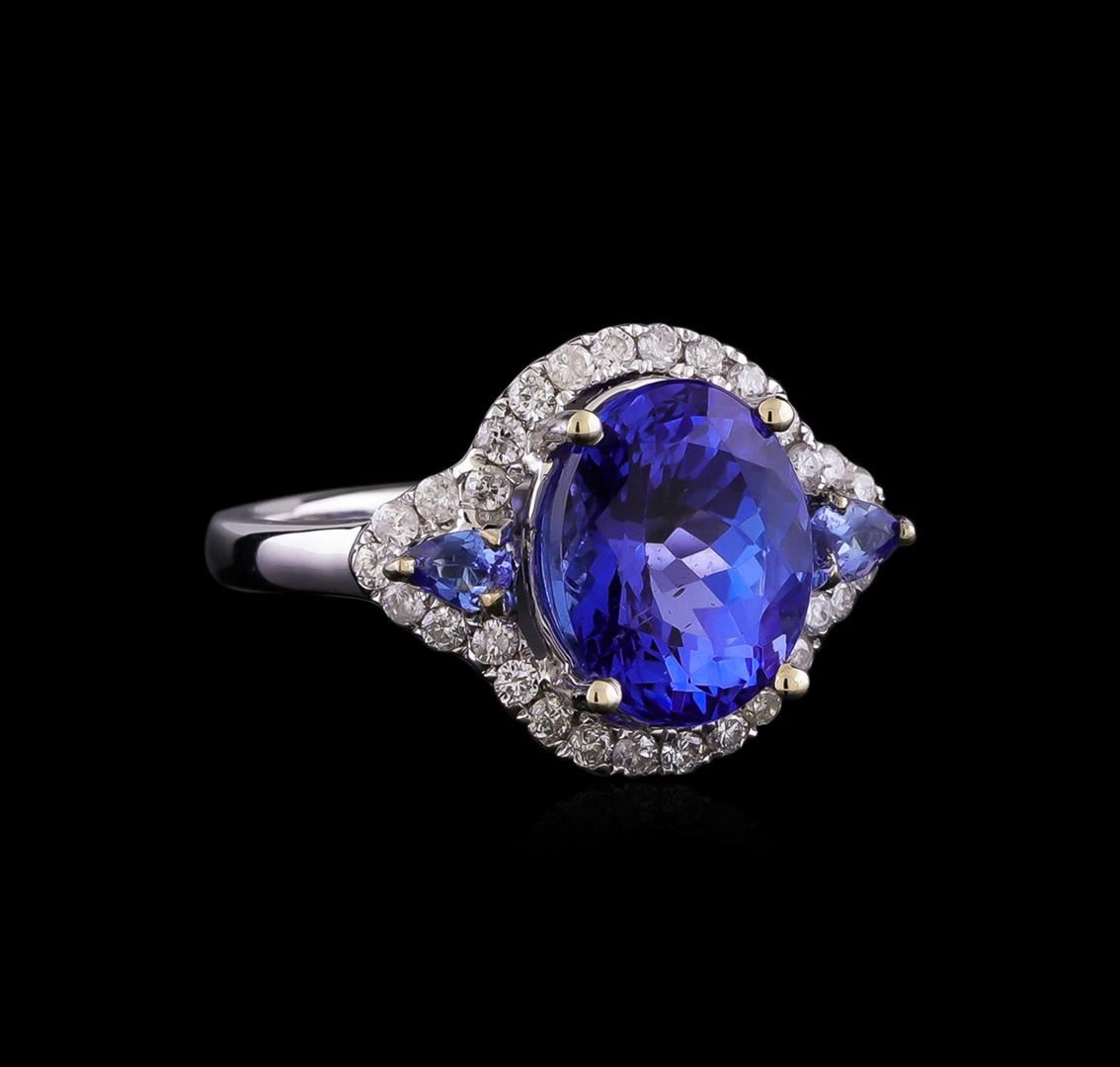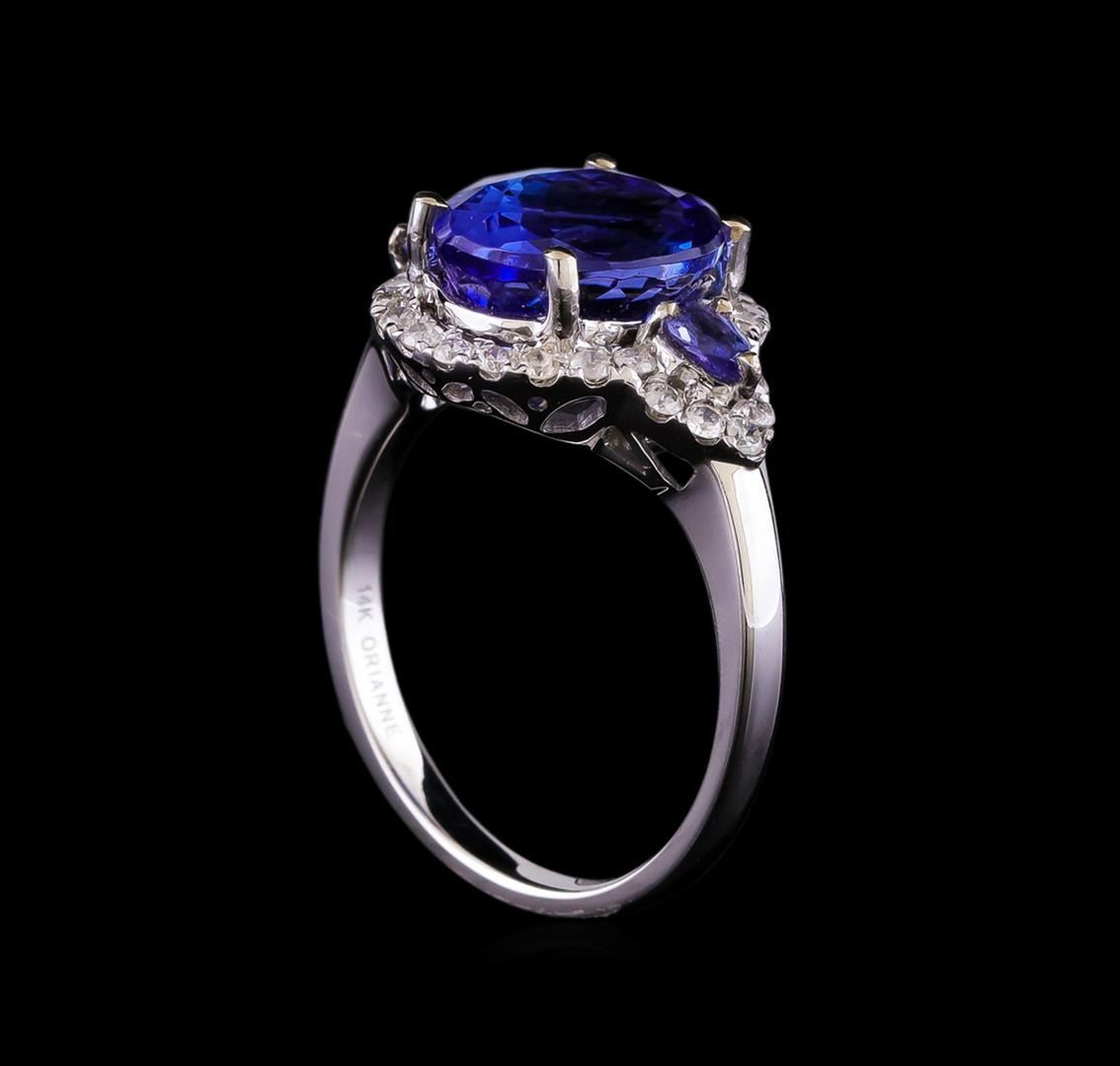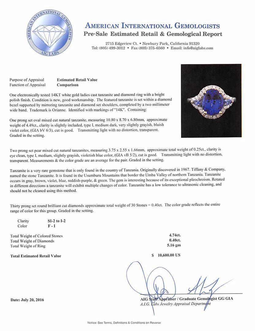 One electronically tested 14KT white gold ladies cast tanzanite and diamond ring with a bright polish finish. The featured tanzanite is set within a diamond bezel supported by mirroring tanzanite and diamond set shoulders, completed by a two millimeter wide band. Trademark is Orianne. Identified with markings of '14K'. Condition is new, good workmanship. Containing: One prong set oval mixed cut natural tanzanite, measuring 10.80 x 8.70 x 6.80mm, approximate weight of 4.49ct., clarity is slightly included, type I, medium dark, very slightly grayish, bluish violet color, (GIA bV 6/3), cut is good. Transmitting light with no distortion, transparent. Graded in the setting. Two prong set pear mixed cut natural tanzanites, measuring 3.75 x 2.55 x 1.66mm, approximate total weight of 0.25ct., clarity is eye clean, type I, medium, slightly grayish, violetish blue color, (GIA vB 5/2), cut is good. Transmitting light with no distortion, transparent. Measurements & the color grade are an average for the pair. Graded in the setting. Tanzanite is a very rare gemstone that is only found in the country of Tanzania. Originally discovered in 1967. Tiffany & Company, named the stone Tanzanite. It is found in the Usumburu Mountains that border the Umba Valley of northern Tanzania. Tanzanite occurs in gray, brown, violet, blue, reddish-purple, & green. The gem is interesting because of its exceptional pleochroism. Rotated in different directions a tanzanite will exhibit multiple changes of color. Tanzanite has a low tolerance to ultrasonic cleaning, and should not be cleaned using this method. Thirty prong set round brilliant cut diamonds approximate total weight of 30 Stones = 0.40ct. The color grade reflects the entire range of color for this group. Graded in the setting. Clarity SI-2 to I-2. Color: F - I. Total Weight of Colored Stones 4.74ct.. Total Weight of Diamonds 0.40ct.. Total Weight of Ring 5.16gm. AIG Appraised at $10,600.00.
