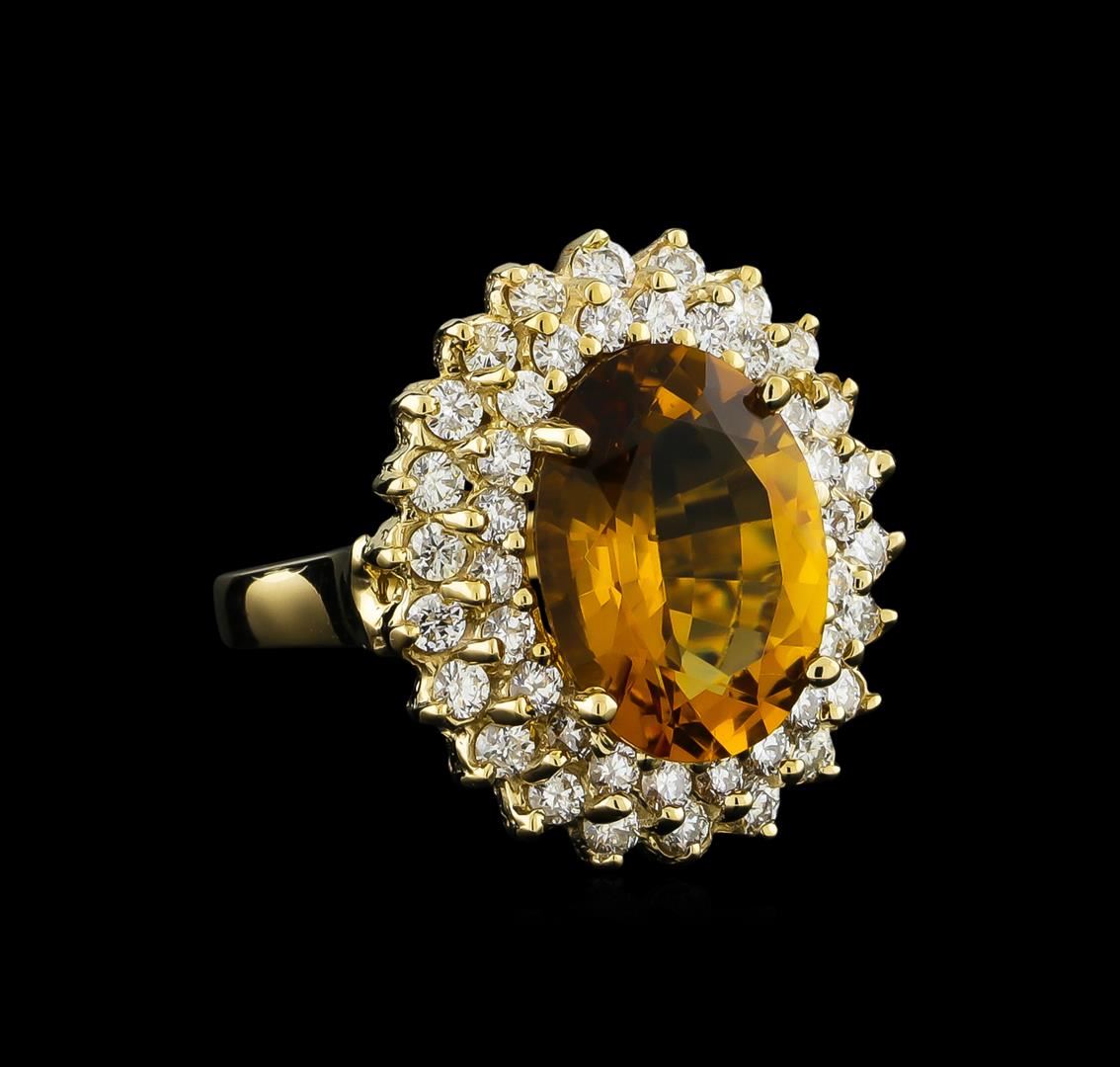 One electronically tested 14KT yellow gold ladies cast citrine and diamond ring with a bright polish finish. The featured citrine is set within tiered diamond florets supported by a ribbed under gallery, completed by a two millimeter wide band. Identified with markings of "14K". Condition is new, good workmanship. Containing: One prong set oval mixed cut natural citrine quartz, measuring 14.00 x 10.60 x 6.00mm, exact weight 4.75ct., clarity is eye clean, type I, medium dark, slightly brownish, yellowish orange color, (GIA yO 6/2), cut is good. Transmitting light with no distortion, transparent. Graded in the setting. Forty-Four prong set round brilliant cut diamonds, measuring 2.10 - 1.90 x 1.20mm exact total weight 44 Stones = 1.33ct. Graded in the setting. Clarity: SI-2 to I-1. Color: G - I. Total Weight of Colored Stones 4.75ct. Total Weight of Diamonds 1.33ct. Total Weight of Ring 8.22gm. AIG Appraised at $5,045.00.