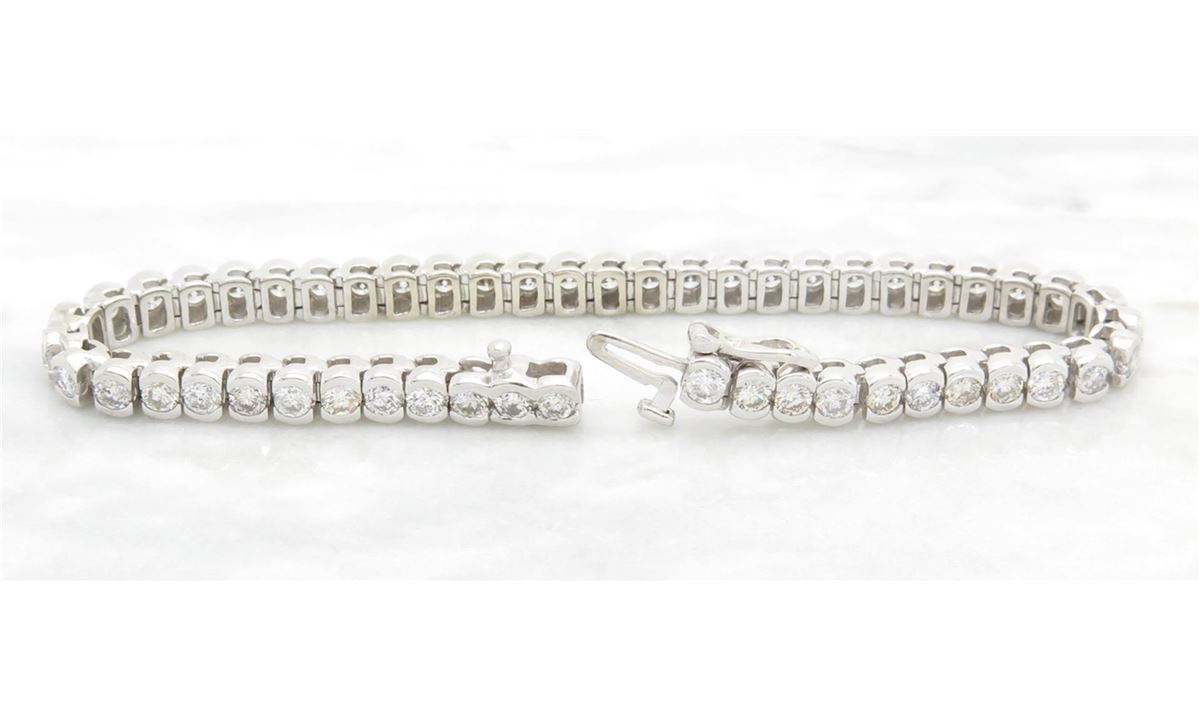 One tested 14K white gold diamond bracelet. Containing: 51 Round Brilliant Cut Diamonds. Clarity: I, Color: G-J. Approximate total diamond weight: 4.75CTW. All diamonds are graded in the mounting unless otherwise stated. Weight of bracelet: 20.9 grams, Size: 7" Long.
