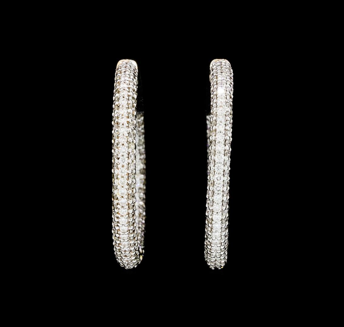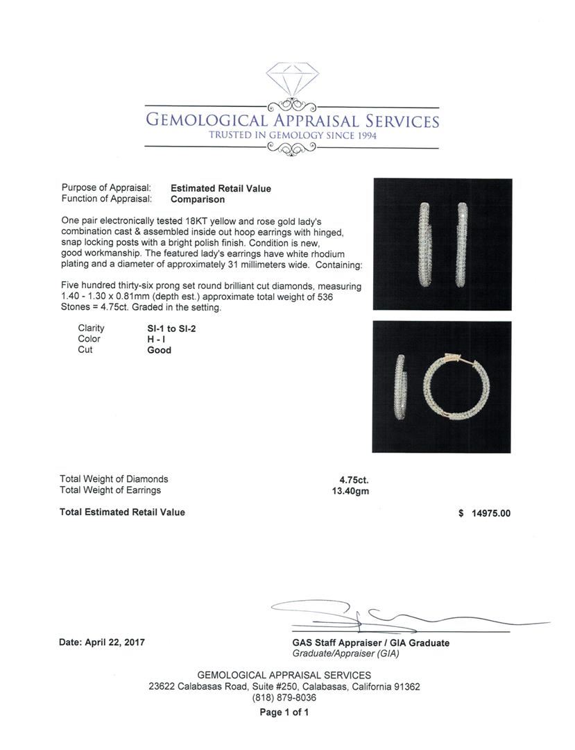 One pair electronically tested 18KT yellow and rose gold lady's combination cast & assembled inside out hoop earrings with hinged, snap locking posts with a bright polish finish. The featured lady's earrings have white rhodium plating and a diameter of approximately 31 millimeters wide. Condition is new, good workmanship. Containing: Five Hundred Thirty-Six prong set round brilliant cut diamonds, measuring 1.40 - 1.30 x 0.81mm (depth est.) approximate total weight of 536 Stones = 4.75ct. Graded in the setting. Color H - I Clarity SI-1 to SI-2 Cut Good. Total Weight of Diamonds 4.75ct.. Total Weight of Earrings 13.40gm GAS Appraised at $14975.00. GAS Appraised at $14,975.00.