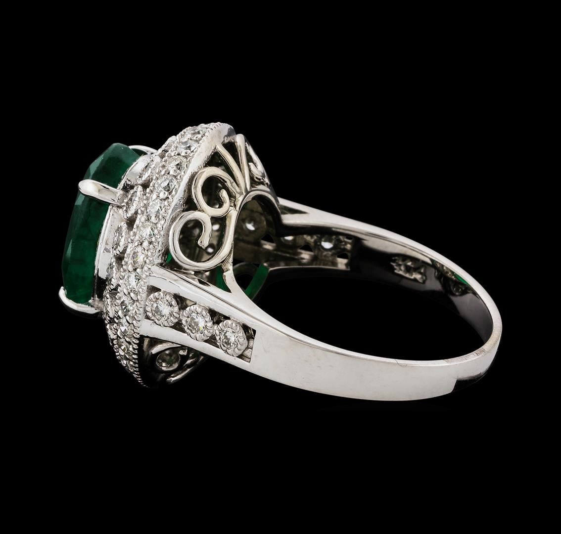 One electronically tested 14KT white gold lady's cast fashion ring with a cathedral double basket halo with a bright polish with milgrain detailing finish. The featured lady's ring has a shank measuring 2.30 millimeters wide. Identified with markings of 'K14'. Condition is new, good workmanship. Containing: One prong set oval modified mixed cut natural emerald, measuring 11.62 x 9.45 x 6.65mm, (depth est.) 14%. bulge factor, approximate weight of 4.75ct., clarity is heavily included, medium dark, moderately strong, green color, (GIA G 6/4), cut is good. Transmitting light somewhat diffusely, semi-transparent to translucent. Naturally occurring internal & external characteristics are present. Indications of oil residue. Colored gemstones are presumed to have been subjected to commonly used enhancement processes. Graded in the setting. Twenty-Two bezel set round brilliant cut diamonds, measuring 1.80 - 1.70 x 1.09mm (depth est.) approximate total weight of 22 Stones = 0.45ct. Graded in the setting. Clarity SI-1 to SI-2. Color: G - H Cut Good Thirty prong set round brilliant cut diamonds, measuring 1.60 - 1.55 x 0.98mm (depth est.) approximate total weight of 30 Stones = 0.46ct. Graded in the setting. Clarity SI-1 to SI-3. Color: G - H Cut Good. Total Weight of Colored Stones 4.75ct.. Total Weight of Diamonds 0.91ct.. Total Weight of Ring 6.70gm. GAS Appraised at $8,505.00.