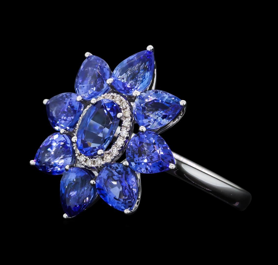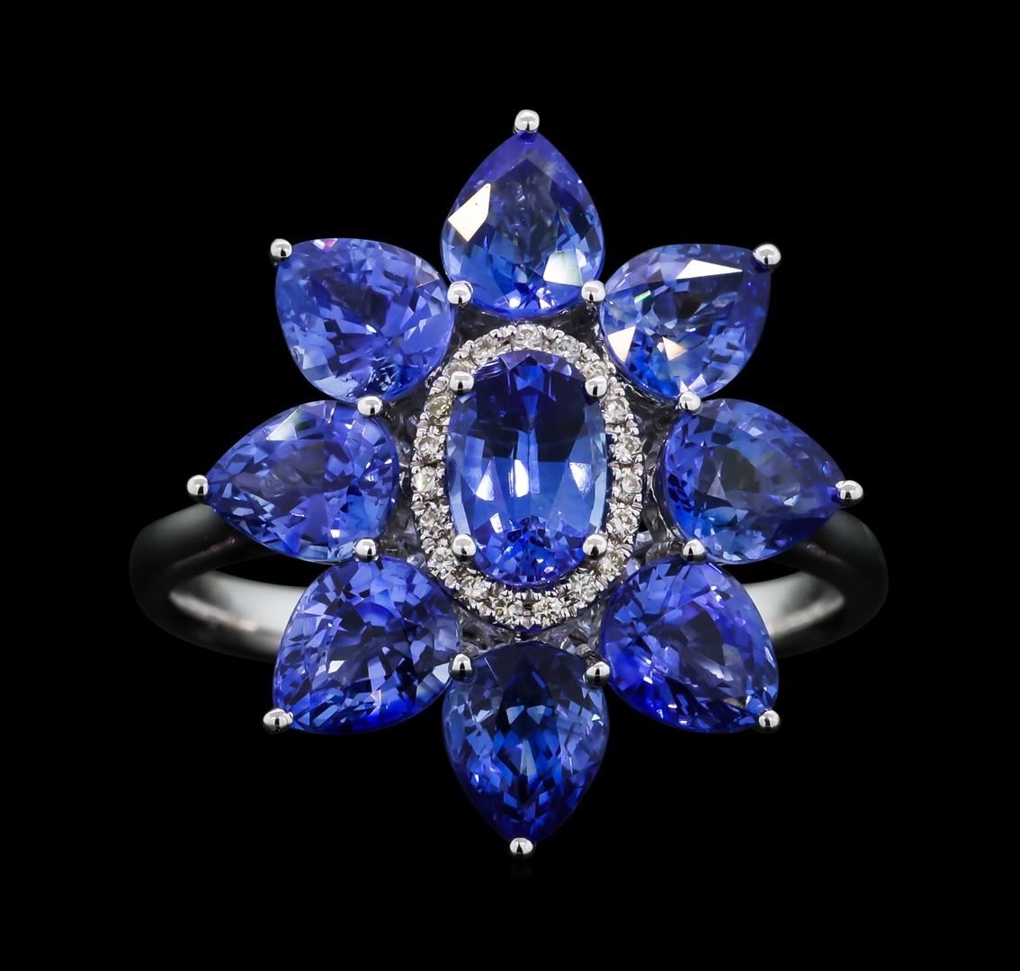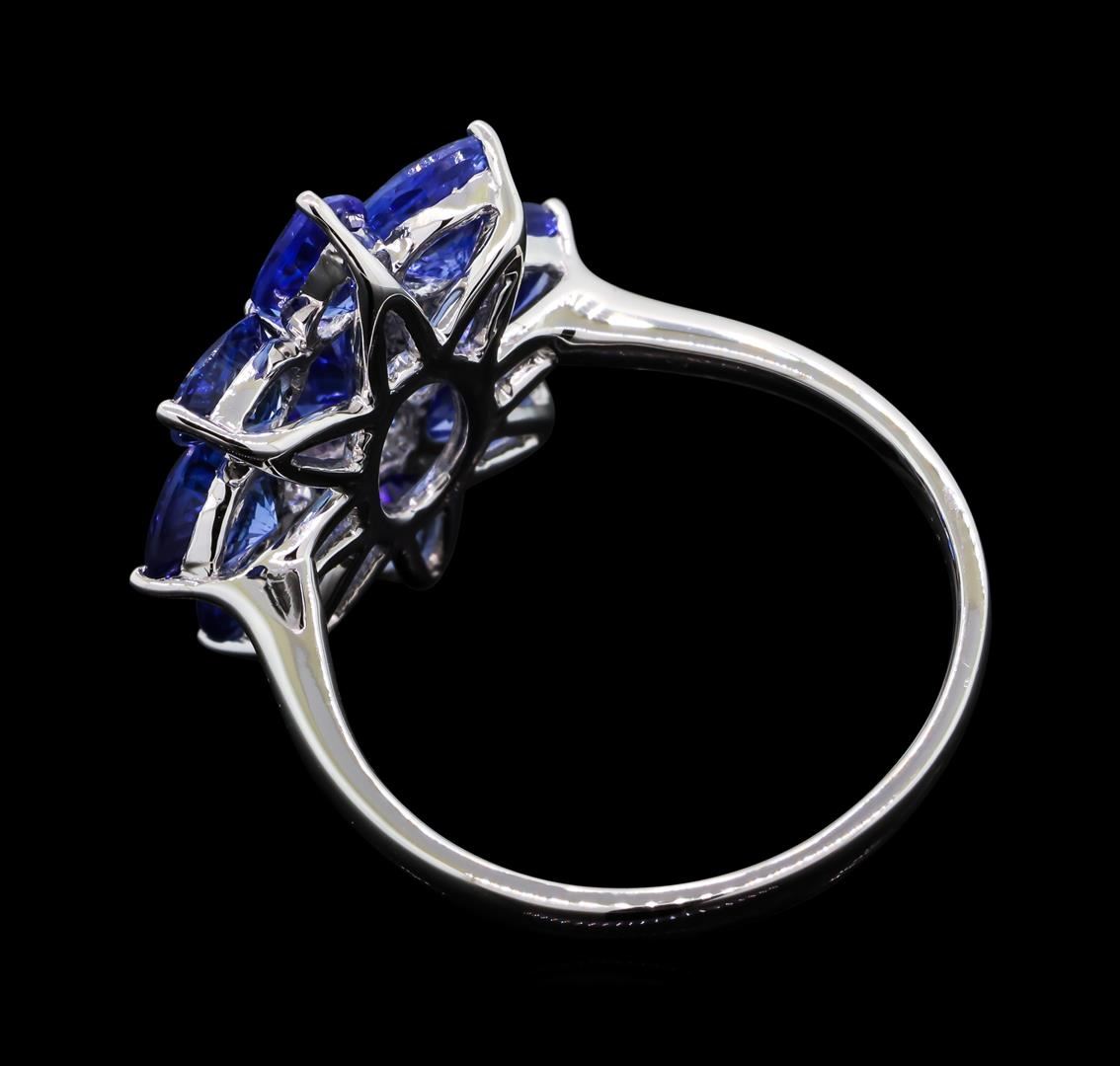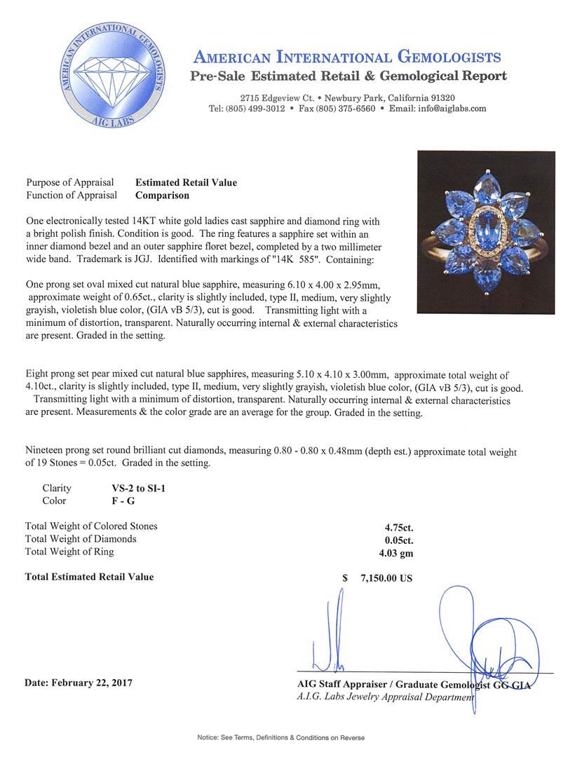 One electronically tested 14KT white gold ladies cast sapphire and diamond ring with a bright polish finish. The ring features a sapphire set within an inner diamond bezel and an outer sapphire floret bezel, completed by a two millimeter wide band. Trademark is JGJ. Identified with markings of '14K 585'. Condition is good. Containing: One prong set oval mixed cut natural blue sapphire, measuring 6.10 x 4.00 x 2.95mm, approximate weight of 0.65ct., clarity is slightly included, type II, medium, very slightly grayish, violetish blue color, (GIA vB 5/3), cut is good. Transmitting light with a minimum of distortion, transparent. Naturally occurring internal & external characteristicsare present. Graded in the setting. Eight prong set pear mixed cut natural blue sapphires, measuring 5.10 x 4.10 x 3.00mm, approximate total weight of 4.10ct., clarity is slightly included, type II, medium, very slightly grayish, violetish blue color, (GIA vB 5/3), cut is good. Transmitting light with a minimum of distortion, transparent. Naturally occurring internal & external characteristics are present. Measurements & the color grade are an average for the group. Graded in the setting. Nineteen prong set round brilliant cut diamonds, measuring 0.80 - 0.80 x 0.48mm (depth est.) approximate total weight of 19 Stones = 0.05ct. Graded in the setting. Clarity VS-2 to SI-1. Color: F - G. Total Weight of Colored Stones 4.75ct.. Total Weight of Diamonds 0.05ct.. Total Weight of Ring 4.03gm. AIG Appraised at $7,150.00.