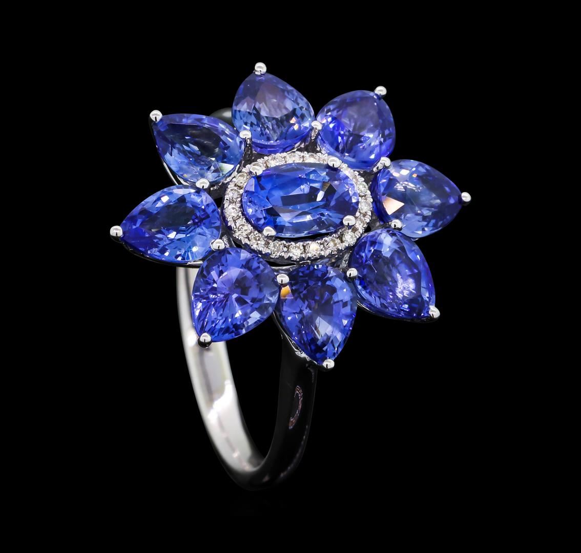 One electronically tested 14KT white gold ladies cast sapphire and diamond ring with a bright polish finish. The ring features a sapphire set within an inner diamond bezel and an outer sapphire floret bezel, completed by a two millimeter wide band. Trademark is JGJ. Identified with markings of '14K 585'. Condition is good. Containing: One prong set oval mixed cut natural blue sapphire, measuring 6.10 x 4.00 x 2.95mm, approximate weight of 0.65ct., clarity is slightly included, type II, medium, very slightly grayish, violetish blue color, (GIA vB 5/3), cut is good. Transmitting light with a minimum of distortion, transparent. Naturally occurring internal & external characteristicsare present. Graded in the setting. Eight prong set pear mixed cut natural blue sapphires, measuring 5.10 x 4.10 x 3.00mm, approximate total weight of 4.10ct., clarity is slightly included, type II, medium, very slightly grayish, violetish blue color, (GIA vB 5/3), cut is good. Transmitting light with a minimum of distortion, transparent. Naturally occurring internal & external characteristics are present. Measurements & the color grade are an average for the group. Graded in the setting. Nineteen prong set round brilliant cut diamonds, measuring 0.80 - 0.80 x 0.48mm (depth est.) approximate total weight of 19 Stones = 0.05ct. Graded in the setting. Clarity VS-2 to SI-1. Color: F - G. Total Weight of Colored Stones 4.75ct.. Total Weight of Diamonds 0.05ct.. Total Weight of Ring 4.03gm. AIG Appraised at $7,150.00.