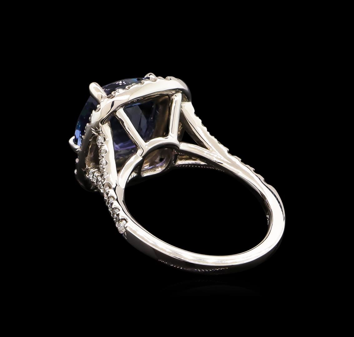 One electronically tested 14KT white gold lady's cast fashion ring with a split shank double halo with a bright polish finish. The featured lady's ring has a shank measuring 1.76 millimeters wide. Identified with markings of "14K". Condition is new, good workmanship. Containing: One prong set square cushion modified brilliant cut natural tanzanite, measuring 9.58 x 9.50 x 6.77mm, approximate weight of 4.75ct., clarity is eye clean, type I, medium dark, very slightly grayish, violetish blue color, (GIA vB 6/3), cut is very good. Transmitting light with no distortion, transparent. Colored gemstones are presumed to have been subjected to commonly used enhancement processes. Graded in the setting. Thirty-Four prong set round brilliant cut diamonds, measuring 1.55 - 1.45 x 0.93mm (depth est.) approximate total weight of 34 Stones = 0.44ct. Graded in the setting. Clarity: SI-1 to I-1. Color: H - I. Cut Good Thirty-Six prong set round brilliant cut diamonds, measuring 1.40 - 1.30 x 0.84mm (depth est.) approximate total weight of 36 Stones = 0.35ct. Graded in the setting. Clarity: SI-1 to I-1. Color: G - I. Cut Good. Total Weight of Colored Stones 4.75ct. Total Weight of Diamonds 0.79ct. Total Weight of Ring 6.20gm. GAS Appraised at $10,860.00.