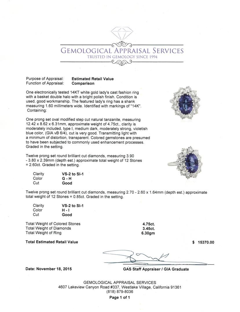 One electronically tested 14KT white gold lady's cast fashion ring with a basket double halo with a bright polish finish. The featured lady's ring has a shank measuring 1.60 millimeters wide. Identified with markings of "14K". Condition is used, good workmanship. Containing: One prong set oval modified step cut natural tanzanite, measuring 12.42 x 8.62 x 6.31mm, approximate weight of 4.75ct., clarity is moderately included, type I, medium dark, moderately strong, violetish blue color, (GIA vB 6/4), cut is very good. Transmitting light with a minimum of distortion, transparent. Colored gemstones are presumed to have been subjected to commonly used enhancement processes. Graded in the setting. Twelve prong set round brilliant cut diamonds, measuring 3.90 - 3.80 x 2.39mm (depth est.) approximate. Total Weight of 12 Stones = 2.60ct. Graded in the setting. Clarity: VS-2 to SI-1. Color: G - Good Twelve prong set round brilliant cut diamonds, measuring 2.70 - 2.60 x 1.64mm (depth est.) approximate. Total Weight of 12 Stones = 0.85ct. Graded in the setting. Clarity: VS-2 to SI-1. Color: H - I. Cut Good. Total Weight of Colored Stones 4.75ct. Total Weight of Diamonds 3.45ct. Total Weight of Ring 6.30gm. GAS Appraised.