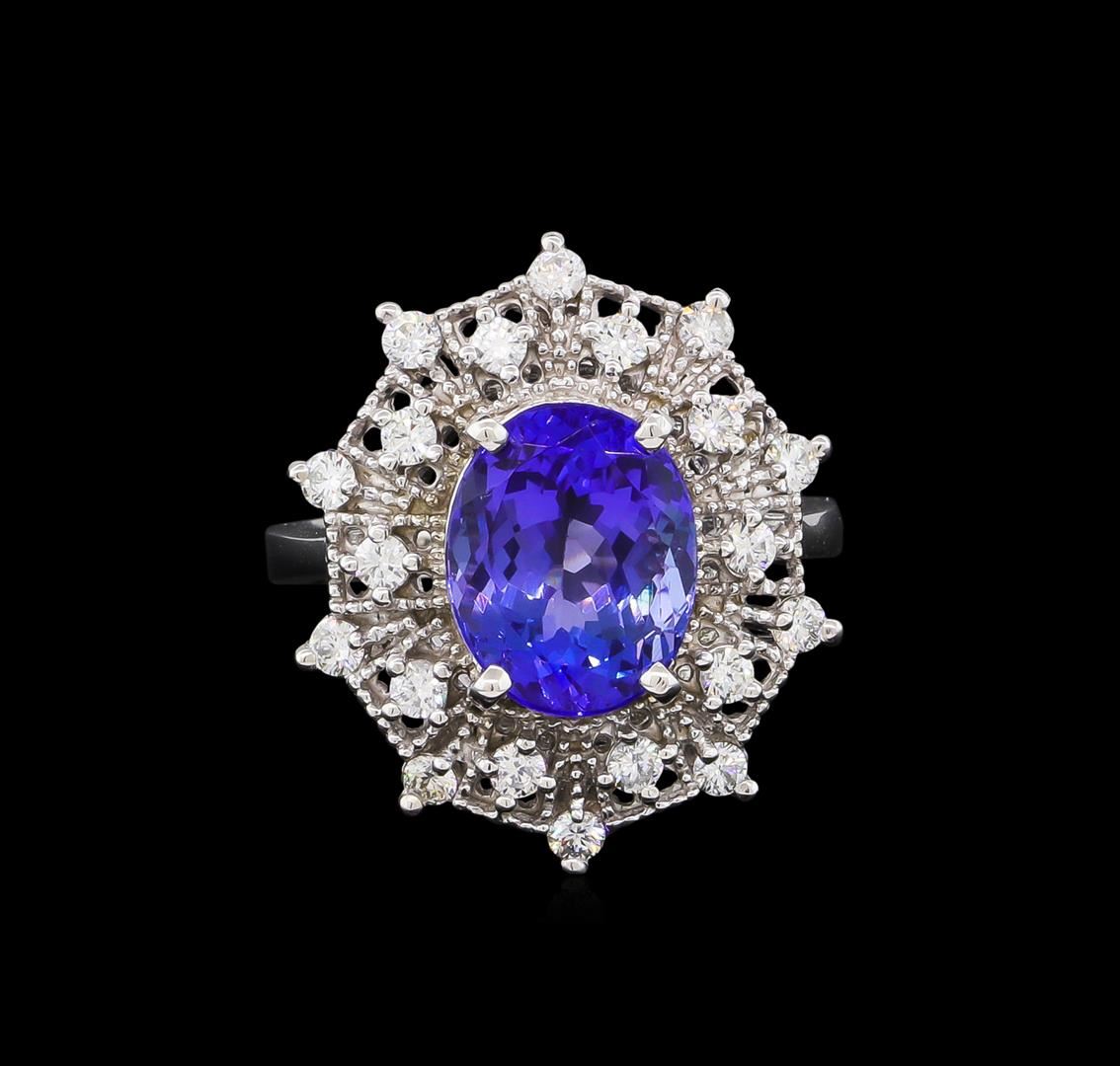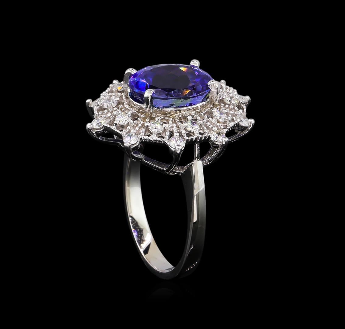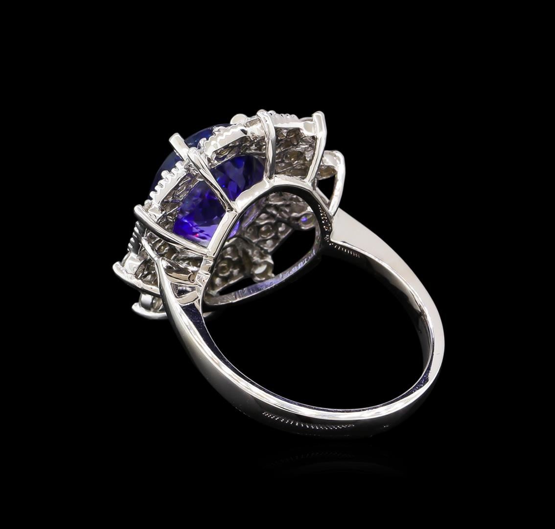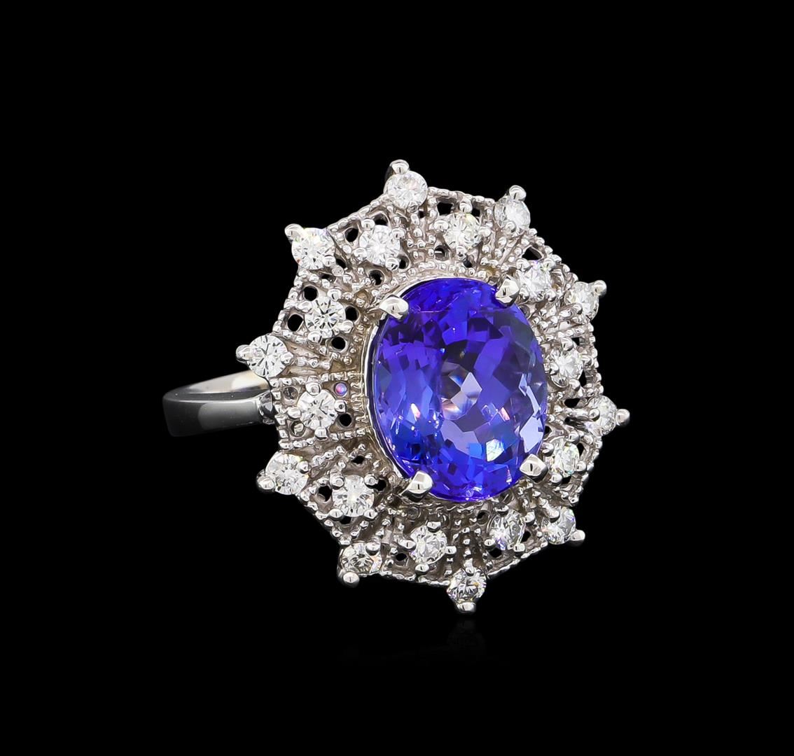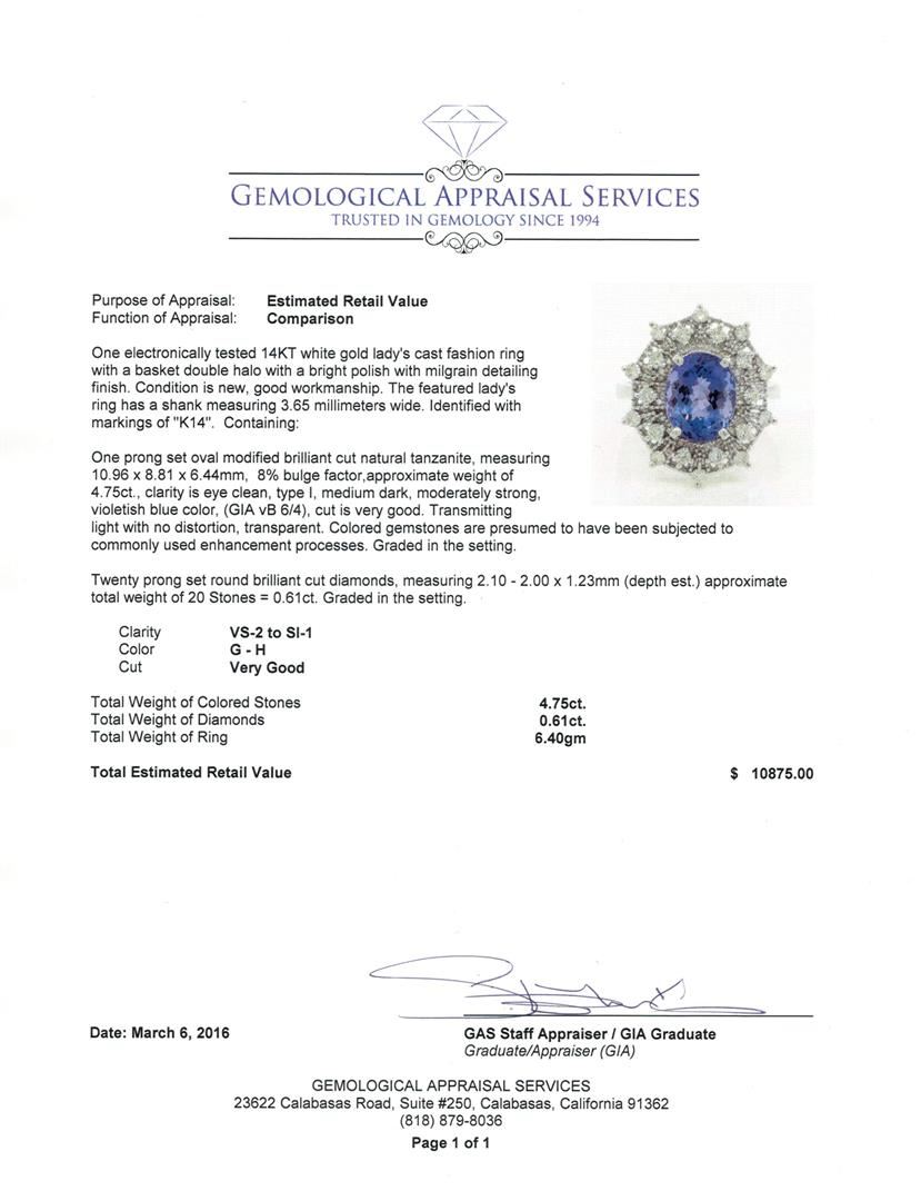 One electronically tested 14KT white gold lady's cast fashion ring with a basket double halo with a bright polish with milgrain detailing finish. The featured lady's ring has a shank measuring 3.65 millimeters wide. Identified with markings of "K14". Condition is new, good workmanship. Containing: One prong set oval modified brilliant cut natural tanzanite, measuring 10.96 x 8.81 x 6.44mm, 8%. bulge factor, approximate weight of 4.75ct., clarity is eye clean, type I, medium dark, moderately strong, violetish blue color, (GIA vB 6/4), cut is very good. Transmitting light with no distortion, transparent. Colored gemstones are presumed to have been subjected to commonly used enhancement processes. Graded in the setting. Twenty prong set round brilliant cut diamonds, measuring 2.10 - 2.00 x 1.23mm (depth est.) approximate. Total Weight of 20 Stones = 0.61ct. Graded in the setting. Clarity: VS-2 to SI-1. Color: G - Very Good. Total Weight of Colored Stones 4.75ct. Total Weight of Diamonds 0.61ct. Total Weight of Ring 6.40gm. GAS Appraised at $10,875.00.