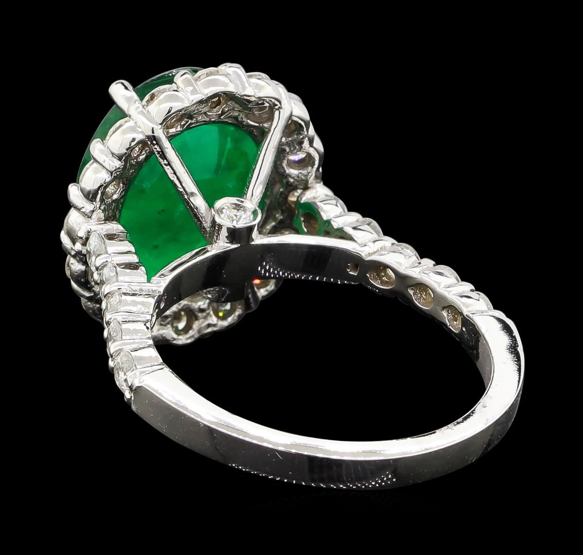 One electronically tested 14KT white gold lady's cast fashion ring with a cathedral halo with a bright polish finish. The featured lady's ring has a shank measuring 2.15 millimeters wide. Identified with markings of '14K'. Condition is new, good workmanship. Containing: One prong set oval modified mixed cut natural emerald, measuring 12.40 x 9.98 x 6.10mm, (depth est.) 10%. bulge factor, approximate weight of 4.76ct., clarity is severely included, medium dark, moderately strong, green color, (GIA G 6/4), cut is good. Transmitting light somewhat diffusely, semi-transparent to translucent. Naturally occurring internal & external characteristics are present. Indications of oil residue. Colored gemstones are presumed to have been subjected to commonly used enhancement processes. Graded in the setting. Twenty-Six prong set round brilliant cut diamonds, measuring 2.30 - 2.20 x 1.35mm (depth est.) approximate total weight of 26 Stones = 1.08ct. Graded in the setting. Clarity SI-1 to I-1. Color: H - I Cut Good Two bezel set round brilliant cut diamonds, measuring 1.90 - 1.80 x 1.15mm (depth est.) approximate total weight of 2 Stones = 0.05ct. Graded in the setting. Clarity VS-2 to SI-1. Color: H - I Cut Very Good. Total Weight of Colored Stones 4.76ct.. Total Weight of Diamonds 1.13ct.. Total Weight of Ring 5.50gm. GAS Appraised at $7,255.00.