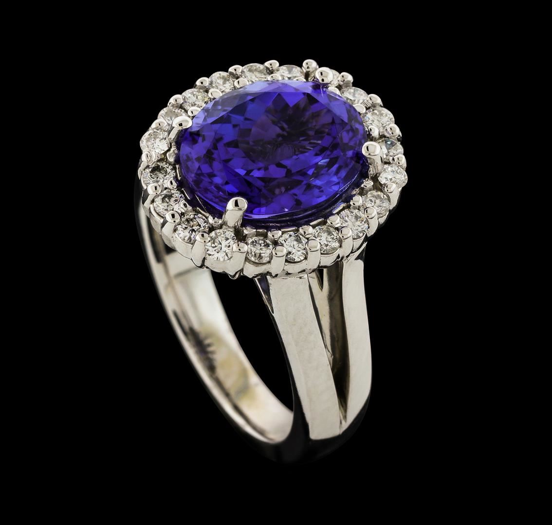 One electronically tested 14KT white gold lady's cast fashion ring with a split shank basket halo with a bright polish finish. The featured lady's ring has a shank measuring 3.16 millimeters wide. Identified with markings of '14K'. Condition is new, good workmanship. Containing: One prong set oval modified brilliant cut natural tanzanite, measuring 11.31 x 9.20 x 6.50mm, (depth est.) approximate weight of 4.76ct., clarity is eye clean, medium dark, moderately strong, violetish blue color, (GIA vB 6/4), cut is very good. Transmitting light with no distortion, transparent. Colored gemstones are presumed to have been subjected to commonly used enhancement processes. Graded in the setting. Twenty prong set round brilliant cut diamonds, measuring 1.90 - 1.80 x 1.15mm (depth est.) approximate total weight of 20 Stones = 0.50ct. Graded in the setting. Clarity VS-2 to SI-2. Color: G - H Cut Good. Total Weight of Colored Stones 4.76ct.. Total Weight of Diamonds 0.50ct.. Total Weight of Ring 9.80gm. GAS Appraised at $9,585.00.