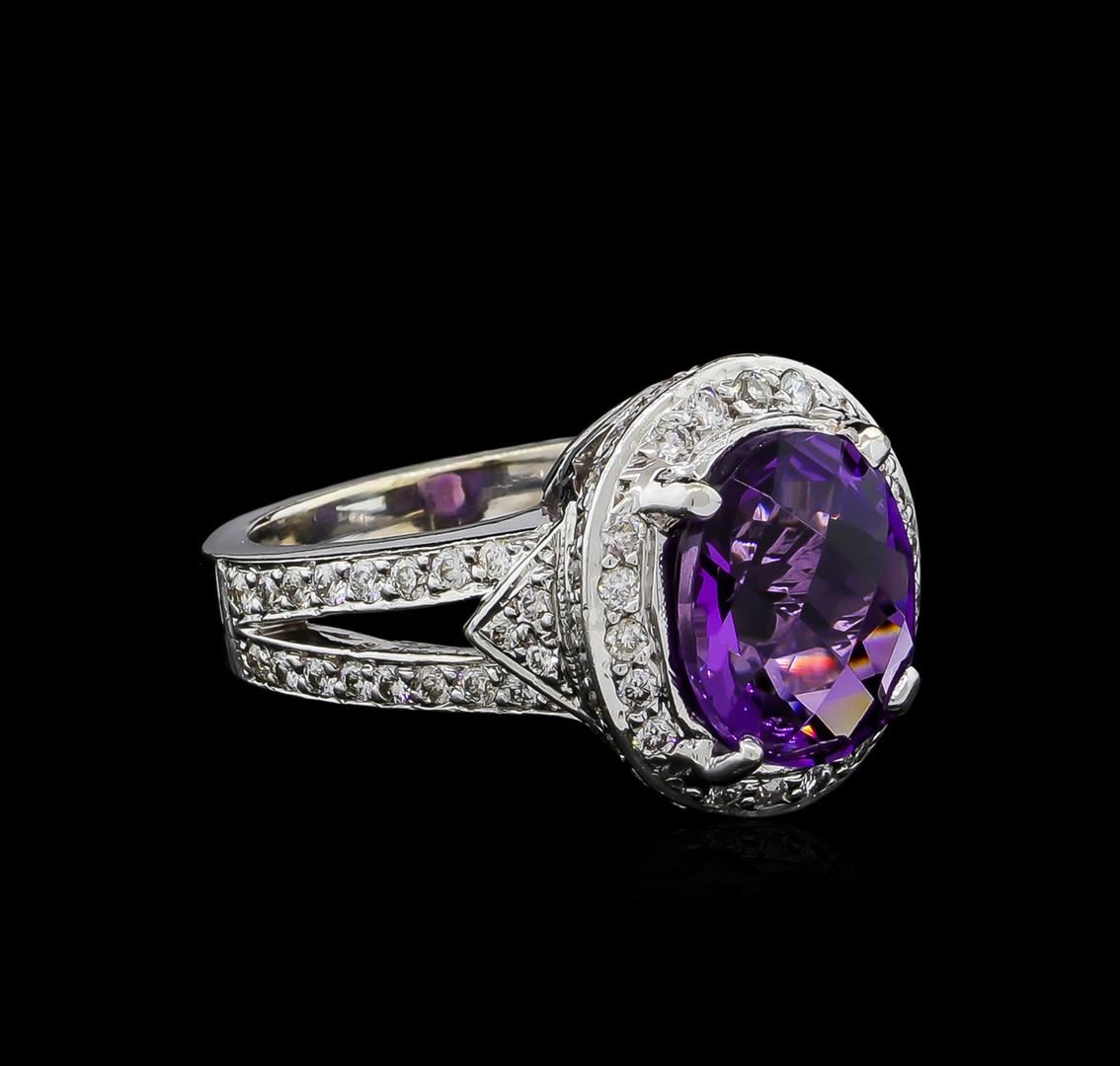 One electronically tested 14KT white gold ladies cast amethyst and diamond ring. The featured amethyst is set within a diamond bezel supported by a lattice under gallery and diamond set split shoulders, completed by a three and one-half millimeter wide band. Bright polish finish with milgrain detailing. Identified with markings of "14K". Condition is good. Containing: One prong set oval mixed cut natural amethyst, measuring 11.85 x 10.00 x 6.65mm, 6%. bulge factor, approximate weight of 4.77ct., clarity is eye clean, type II, medium dark, very slightly grayish, purple color, (GIA P 6/3), cut is good. Transmitting light with no distortion, transparent. Graded in the setting. Fifty prong set round brilliant cut diamonds, measuring 1.70 - 1.60 x 0.99mm (depth est.) approximate total weight of 50 Stones = 0.92ct. Graded in the setting. Clarity: SI-1 to I-1. Color: G - I Thirty-Six prong set round brilliant cut diamonds, measuring 1.50 - 1.30 x 0.84mm (depth est.) approximate total weight of 36 Stones = 0.46ct. Graded in the setting. Clarity: SI-1 to I-1. Color: G - I. Total Weight of Colored Stones 4.77ct. Total Weight of Diamonds 1.38ct. Total Weight of Ring 12.81gm. AIG Appraised at $6,120.00.