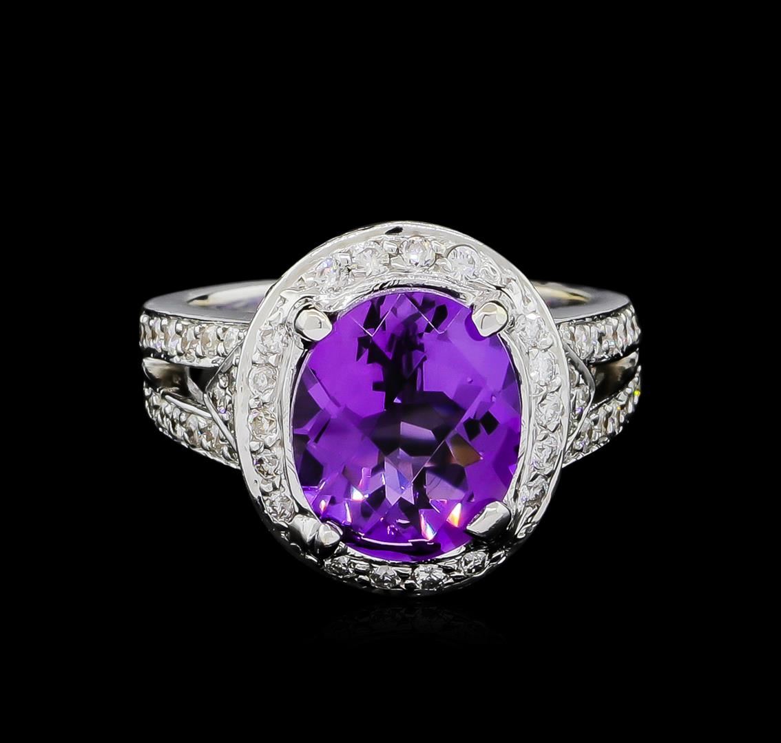One electronically tested 14KT white gold ladies cast amethyst and diamond ring. The featured amethyst is set within a diamond bezel supported by a lattice under gallery and diamond set split shoulders, completed by a three and one-half millimeter wide band. Bright polish finish with milgrain detailing. Identified with markings of "14K". Condition is good. Containing: One prong set oval mixed cut natural amethyst, measuring 11.85 x 10.00 x 6.65mm, 6%. bulge factor, approximate weight of 4.77ct., clarity is eye clean, type II, medium dark, very slightly grayish, purple color, (GIA P 6/3), cut is good. Transmitting light with no distortion, transparent. Graded in the setting. Fifty prong set round brilliant cut diamonds, measuring 1.70 - 1.60 x 0.99mm (depth est.) approximate total weight of 50 Stones = 0.92ct. Graded in the setting. Clarity: SI-1 to I-1. Color: G - I Thirty-Six prong set round brilliant cut diamonds, measuring 1.50 - 1.30 x 0.84mm (depth est.) approximate total weight of 36 Stones = 0.46ct. Graded in the setting. Clarity: SI-1 to I-1. Color: G - I. Total Weight of Colored Stones 4.77ct. Total Weight of Diamonds 1.38ct. Total Weight of Ring 12.81gm. AIG Appraised at $6,120.00.