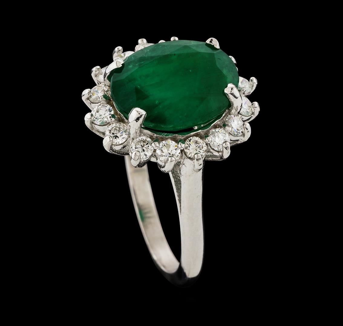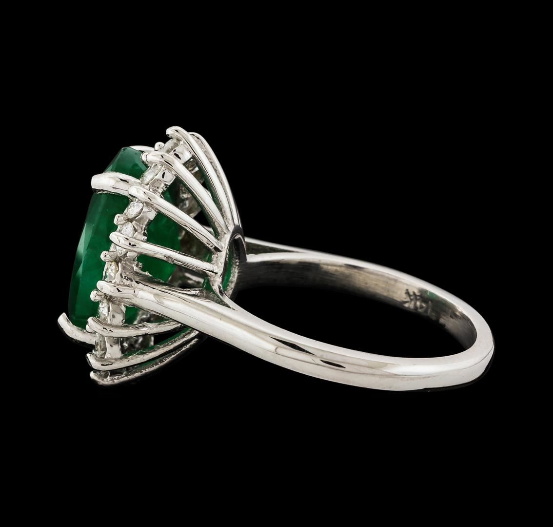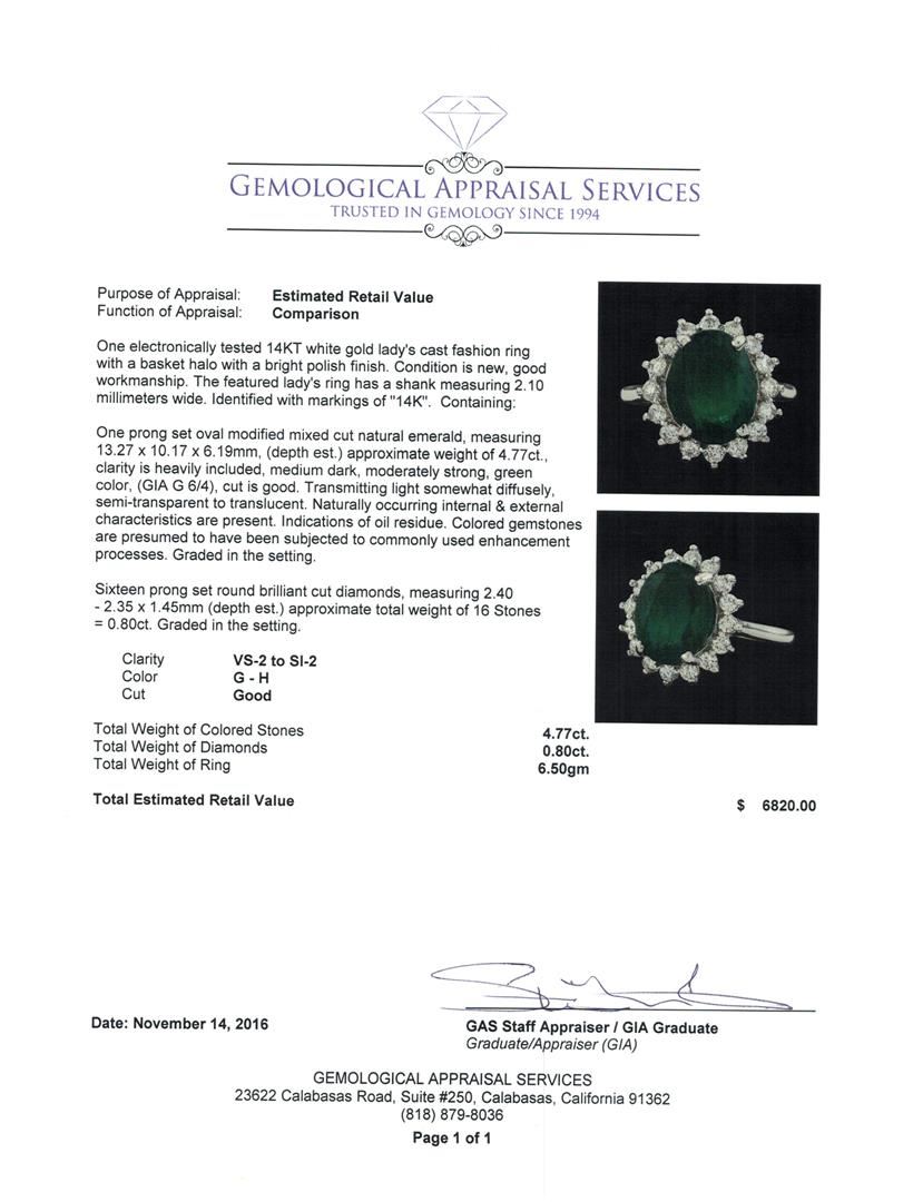 One electronically tested 14KT white gold lady's cast fashion ring with a basket halo with a bright polish finish. The featured lady's ring has a shank measuring 2.10 millimeters wide. Identified with markings of '14K'. Condition is new, good workmanship. Containing: One prong set oval modified mixed cut natural emerald, measuring 13.27 x 10.17 x 6.19mm, (depth est.) approximate weight of 4.77ct., clarity is heavily included, medium dark, moderately strong, green color, (GIA G 6/4), cut is good. Transmitting light somewhat diffusely, semi-transparent to translucent. Naturally occurring internal & external characteristics are present. Indications of oil residue. Colored gemstones are presumed to have been subjected to commonly used enhancement processes. Graded in the setting. Sixteen prong set round brilliant cut diamonds, measuring 2.40 - 2.35 x 1.45mm (depth est.) approximate total weight of 16 Stones = 0.80ct. Graded in the setting. Clarity VS-2 to SI-2. Color: G - H Cut Good. Total Weight of Colored Stones 4.77ct.. Total Weight of Diamonds 0.80ct.. Total Weight of Ring 6.50gm GAS Appraised at $6,820.00.