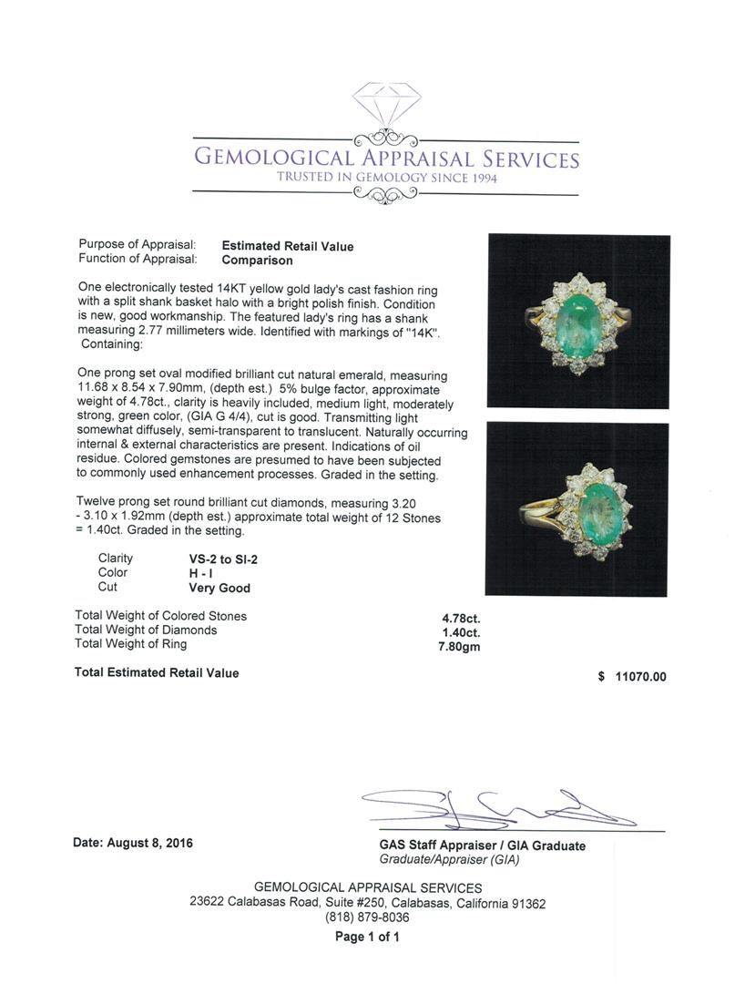 One electronically tested 14KT yellow gold lady's cast fashion ring with a split shank basket halo with a bright polish finish. The featured lady's ring has a shank measuring 2.77 millimeters wide. Identified with markings of '14K'. Condition is new, good workmanship. Containing: One prong set oval modified brilliant cut natural emerald, measuring 11.68 x 8.54 x 7.90mm, (depth est.) 5%. bulge factor, approximate weight of 4.78ct., clarity is heavily included, medium light, moderately strong, green color, (GIA G 4/4), cut is good. Transmitting light somewhat diffusely, semi-transparent to translucent. Naturally occurring internal & external characteristics are present. Indications of oil residue. Colored gemstones are presumed to have been subjected to commonly used enhancement processes. Graded in the setting. Twelve prong set round brilliant cut diamonds, measuring 3.20 - 3.10 x 1.92mm (depth est.) approximate total weight of 12 Stones = 1.40ct. Graded in the setting. Clarity VS-2 to SI-2. Color: H - I Cut Very Good. Total Weight of Colored Stones 4.78ct.. Total Weight of Diamonds 1.40ct.. Total Weight of Ring 7.80gm. GAS Appraised at $11,070.00.