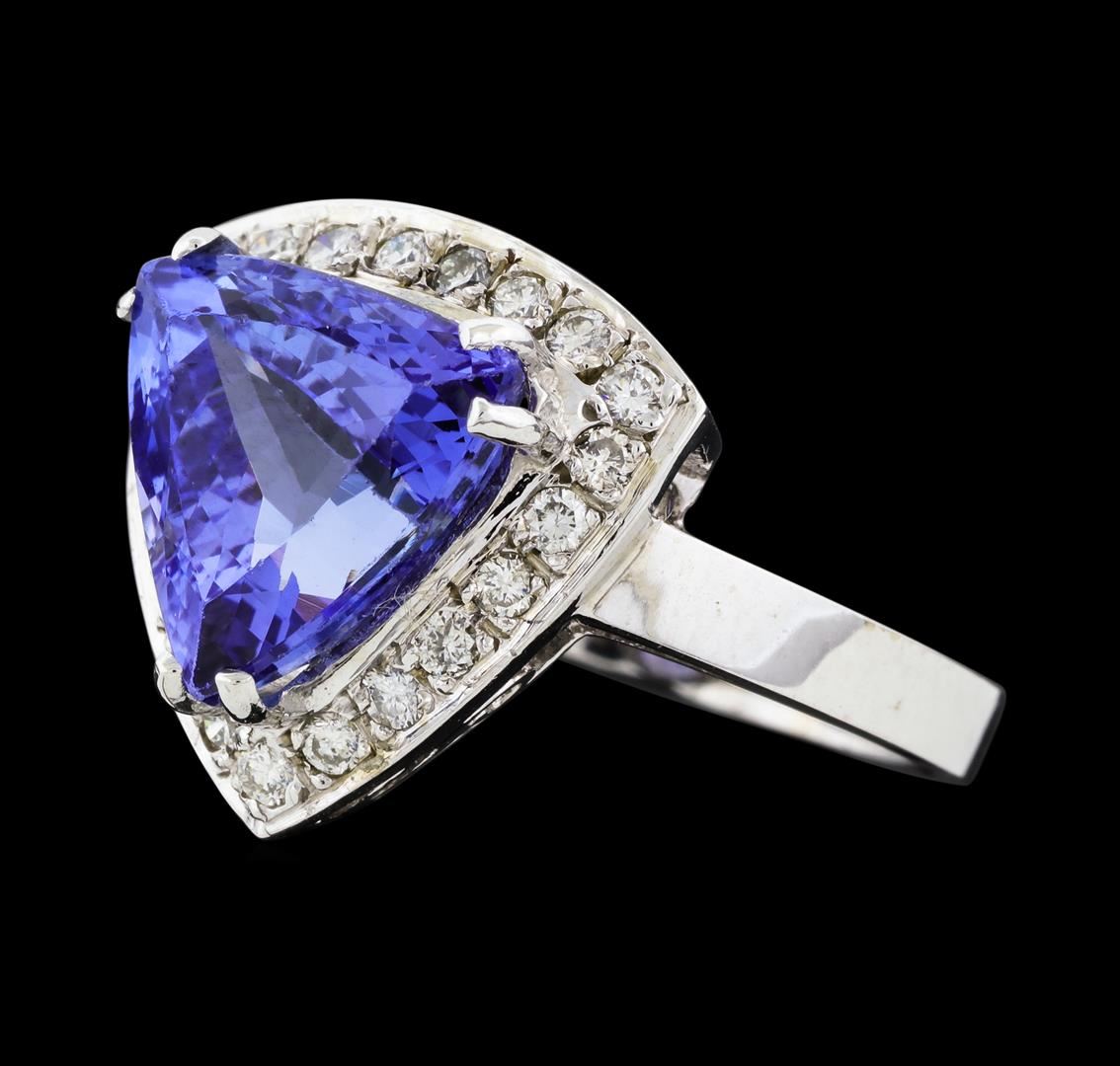 One electronically tested 14KT white gold lady's cast fashion ring with a cathedral halo with a bright polish finish. The featured lady's ring has a shank measuring 1.90 millimeters wide. Identified with markings of 'K14'. Condition is new, good workmanship. Containing: One prong set triangle modified brilliant cut natural tanzanite, measuring 10.74 x 10.50 x 6.89mm, (depth est.) approximate weight of 4.78ct., clarity is eye clean, medium, moderately strong, bluish violet color, (GIA bV 5/4), cut is very good. Transmitting light with no distortion, transparent. Colored gemstones are presumed to have been subjected to commonly used enhancement processes. Graded in the setting. Twenty-Four bead set round brilliant cut diamonds, measuring 1.70 - 1.65 x 1.04mm (depth est.) approximate total weight of 24 Stones = 0.44ct. Graded in the setting. Clarity SI-1 to I-1. Color: H - I Cut Good. Total Weight of Colored Stones 4.78ct.. Total Weight of Diamonds 0.44ct.. Total Weight of Ring 5.30gm. GAS Appraised at $8,960.00.