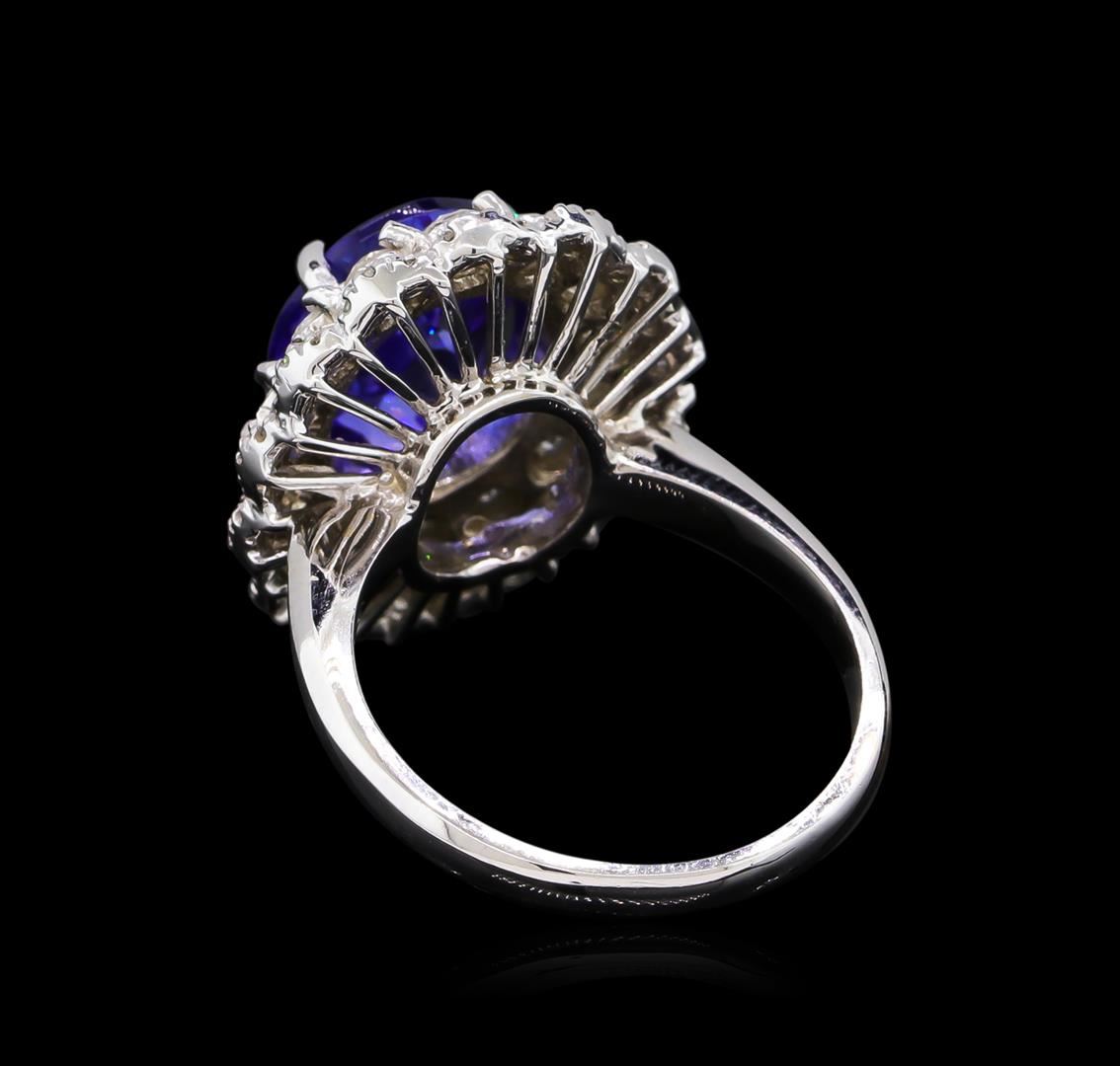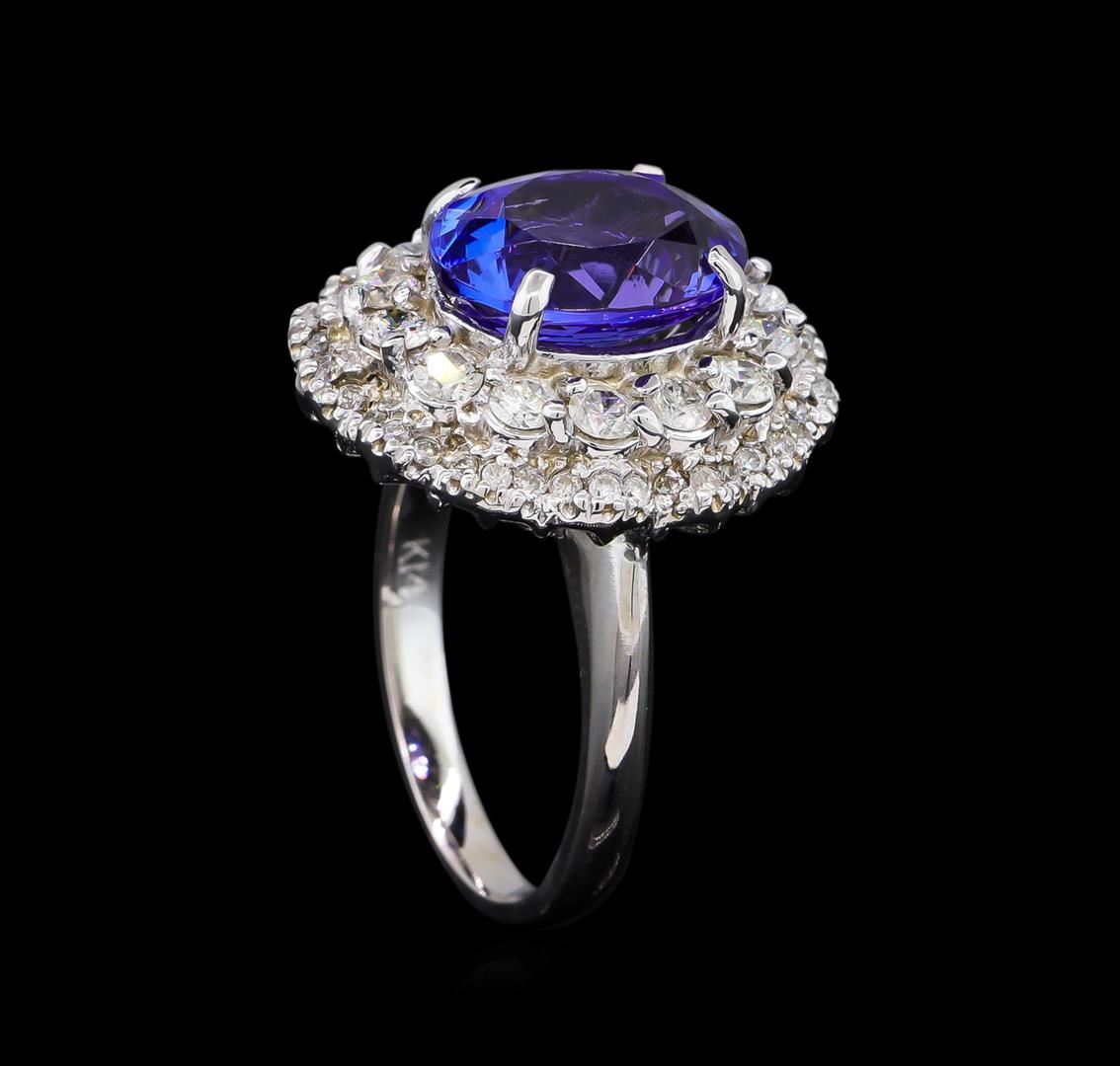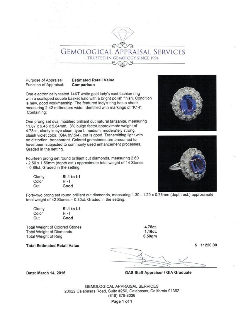 One electronically tested 14KT white gold lady's cast fashion ring with a scalloped double basket halo with a bright polish finish. The featured lady's ring has a shank measuring 2.42 millimeters wide. Identified with markings of "K14". Condition is new, good workmanship. Containing: One prong set oval modified brilliant cut natural tanzanite, measuring 11.87 x 9.45 x 5.84mm, 3%. bulge factor, approximate weight of 4.78ct., clarity is eye clean, type I, medium, moderately strong, bluish violet color, (GIA bV 5/4), cut is good. Transmitting light with no distortion, transparent. Colored gemstones are presumed to have been subjected to commonly used enhancement processes. Graded in the setting. Fourteen prong set round brilliant cut diamonds, measuring 2.60 - 2.50 x 1.56mm (depth est.) approximate total weight of 14 Stones = 0.86ct. Graded in the setting. Clarity: SI-1 to I-1. Color: H - I. Cut Good Forty-Two prong set round brilliant cut diamonds, measuring 1.30 - 1.20 x 0.75mm (depth est.) approximate total weight of 42 Stones = 0.30ct. Graded in the setting. Clarity: SI-1 to I-1. Color: H - I. Cut Good. Total Weight of Colored Stones 4.78ct. Total Weight of Diamonds 1.16ct. Total Weight of Ring 8.50gm. GAS Appraised at $11,220.00.
