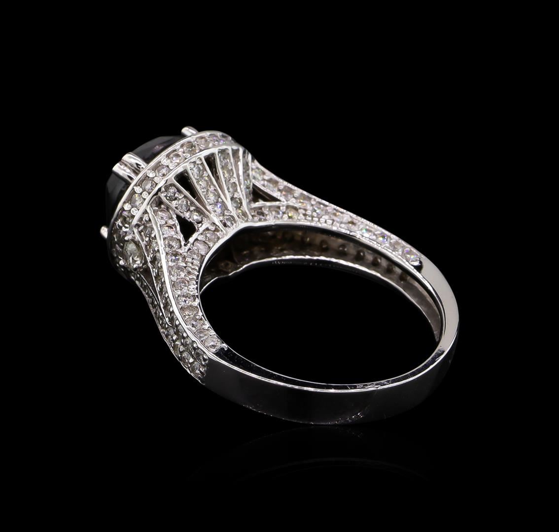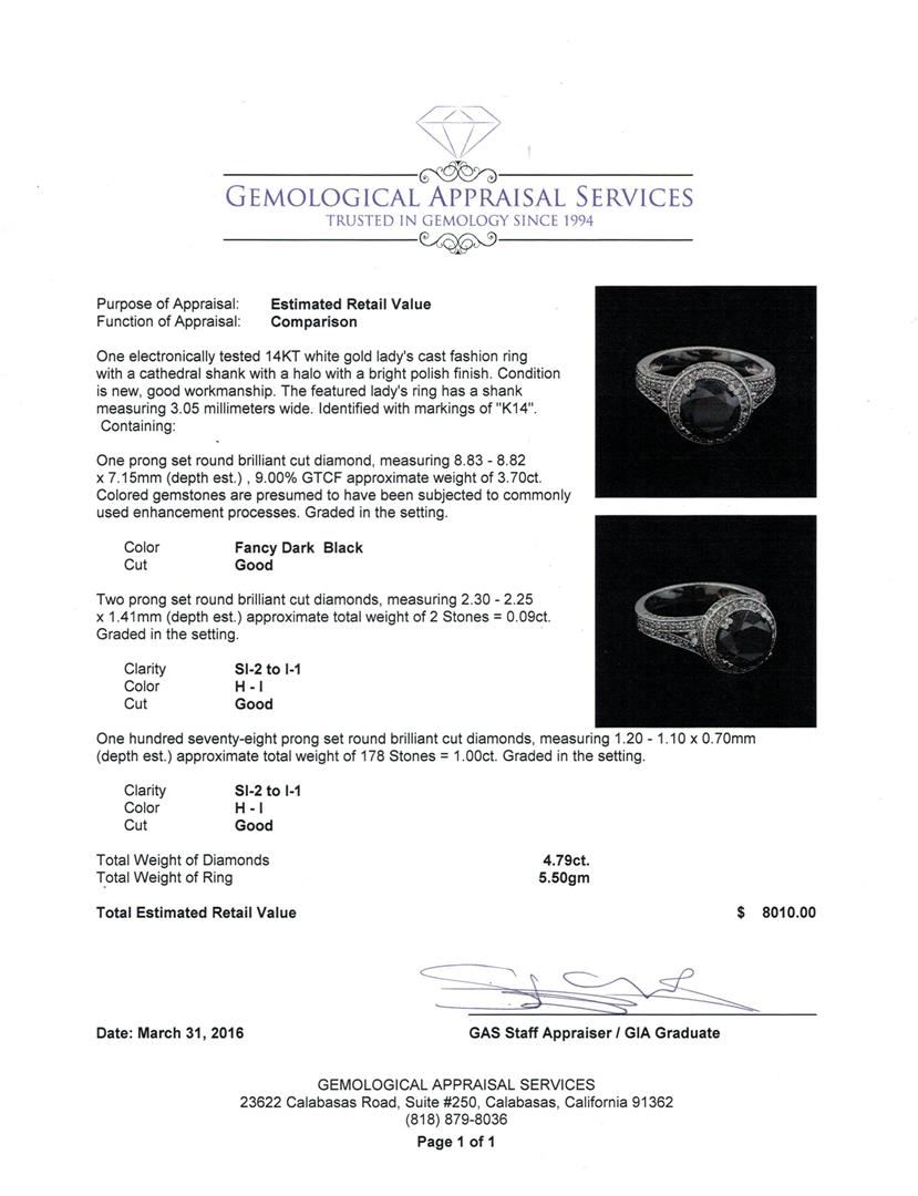 One electronically tested 14KT white gold lady's cast fashion ring with a cathedral shank with a halo with a bright polish finish. The featured lady's ring has a shank measuring 3.05 millimeters wide. Identified with markings of "K14". Condition is new, good workmanship. Containing: One prong set round brilliant cut diamond, measuring 8.83 - 8.82 x 7.15mm (depth est.) , 9.00.%. GTCF approximate weight of 3.70ct. Colored gemstones are presumed to have been subjected to commonly used enhancement processes. Graded in the setting. Cut Good Two prong set round brilliant cut diamonds, measuring 2.30 - 2.25 x 1.41mm (depth est.) approximate total weight of 2 Stones = 0.09ct. Graded in the setting. Clarity: SI-2 to I-1. Color: H - I. Cut Good One Hundred Seventy-Eight prong set round brilliant cut diamonds, measuring 1.20 - 1.10 x 0.70mm (depth est.) approximate total weight of 178 Stones = 1.00ct. Graded in the setting. Clarity: SI-2 to I-1. Color: H - I. Cut Good. Total Weight of Diamonds 4.79ct. Total Weight of Ring 5.50gm GAS Appraised.