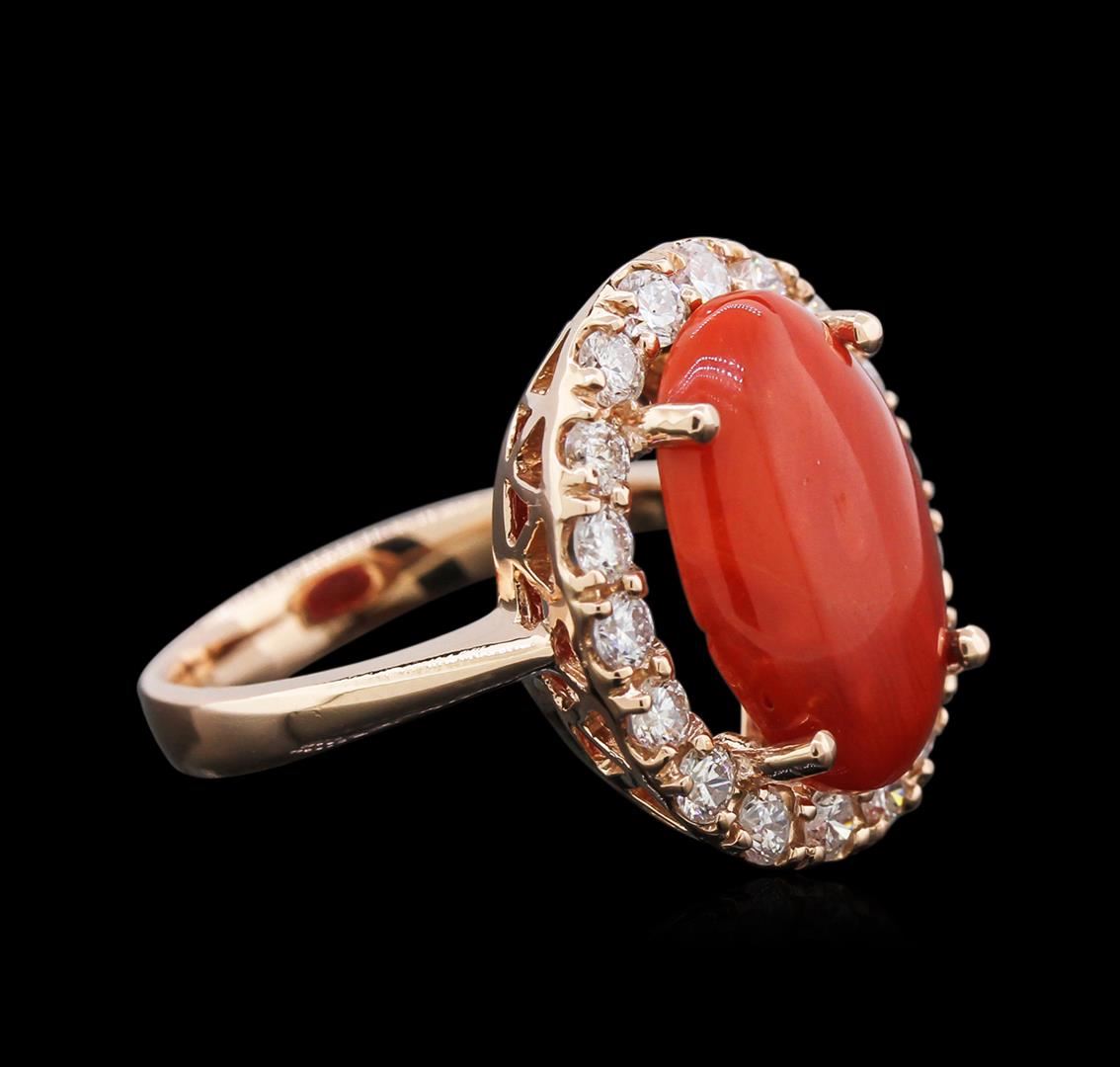 One stamped & tested 14KT rose gold lady's cast cocktail ring with a half round shank with a bright polish finish. Condition is new. Identified with markings of "14K". Containing: One prong set cabochon cut natural red coral, measuring 16.20 x 11.45 x 3.50mm, approximate weight of 4.80ct., medium dark, very slightly brownish, red orange color, (GIA RO 6/3), cut is very good. Graded in setting. Eighteen prong set round brilliant cut diamonds, measuring 2.50 - 2.45 x 1.49mm (depth est.) approximate total weight of 18 Stones = 1.04ct. Graded in setting. Clarity: SI-1 to SI-2. Color: H - I. Cut: Good. Total Weight of Colored Stones: 4.80ct. Total Weight of Diamonds: 1.04ct. Total Weight of Ring: 6.70 gm. GAS Appraised at $5,355.00.