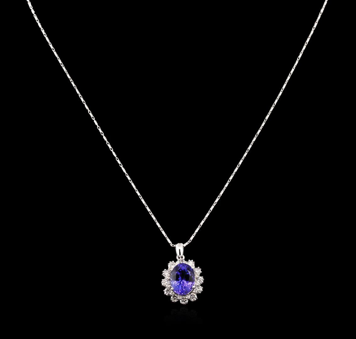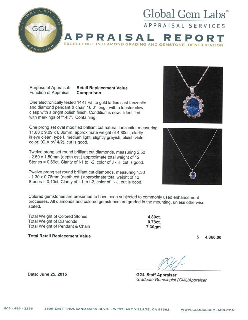One electronically tested 14KT white gold ladies cast tanzanite and diamond pendant & chain 16.0" long, with a lobster claw clasp with a bright polish finish. Identified with markings of "14K". Condition is new. Containing: One prong set oval modified brilliant cut natural tanzanite, measuring 11.80 x 9.09 x 6.36mm, approximate weight of 4.80ct., clarity is eye clean, type I, medium light, slightly grayish, bluish violet color, (GIA bV 4/2), cut is good. Twelve prong set round brilliant cut diamonds, measuring 2.50 - 2.50 x 1.50mm (depth est.) approximate. Total Weight of 12 Stones = 0.69ct. Clarity: I-1 to I-2. Color: J - K, Cut is Good. Twelve prong set round brilliant cut diamonds, measuring 1.30 - 1.30 x 0.78mm (depth est.) approximate. Total Weight of 12 Stones = 0.10ct. Clarity: I-1 to I-2. Color: I - J, Cut is Good. Colored gemstones are presumed to have been subjected to commonly used enhancement processes. All diamonds and colored gemstones are graded in the mounting, unless otherwise stated. Total Weight of Colored Stones 4.80ct. Total Weight of Diamonds 0.78ct. Total Weight of Pendant & Chain 7.30 grams. GGL Appraised at $4,860.00.