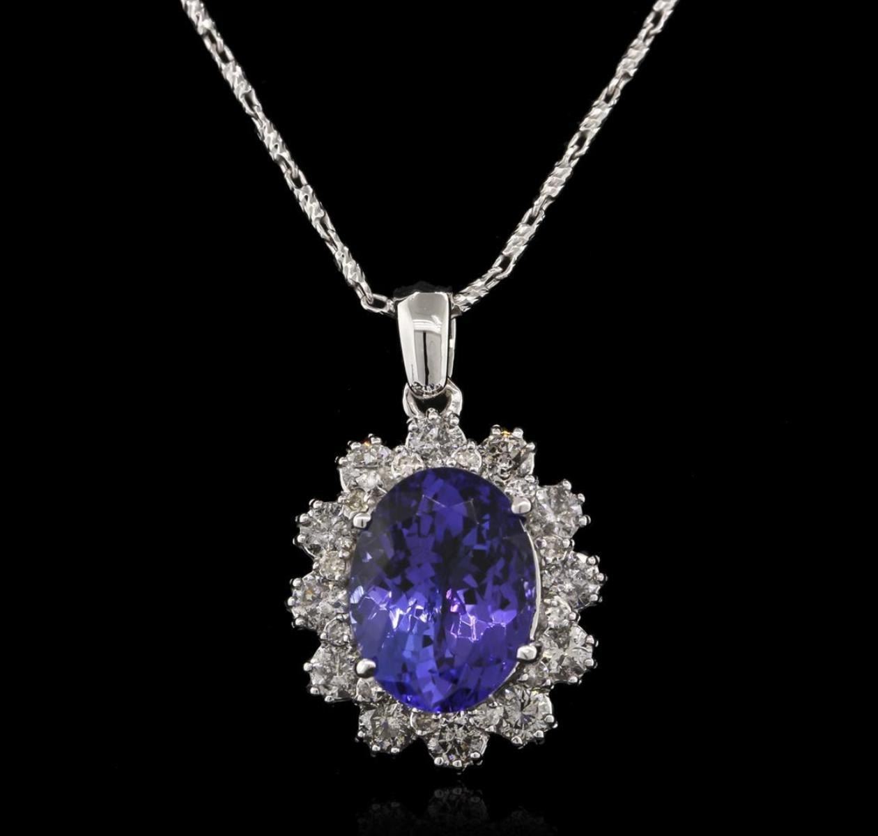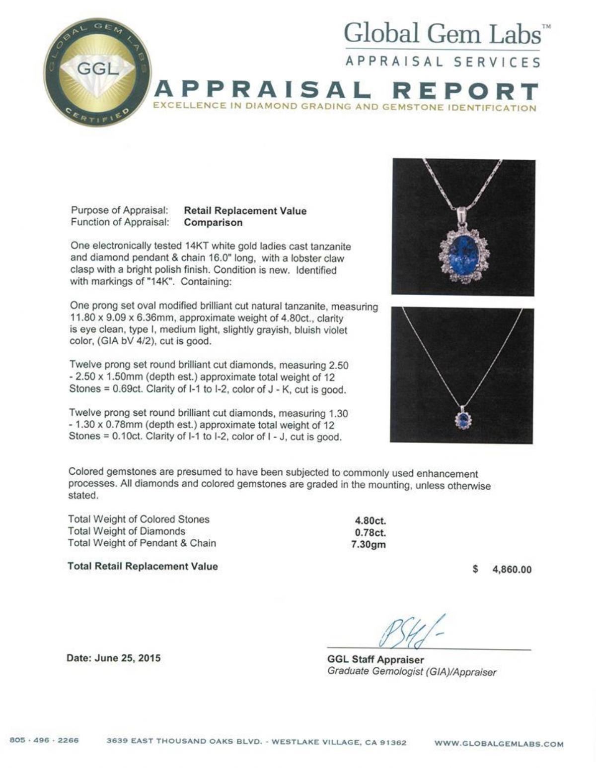 One electronically tested 14KT white gold ladies cast tanzanite and diamond pendant & chain 16.0" long, with a lobster claw clasp with a bright polish finish. Identified with markings of "14K". Condition is new. Containing: One prong set oval modified brilliant cut natural tanzanite, measuring 11.80 x 9.09 x 6.36mm, approximate weight of 4.80ct., clarity is eye clean, type I, medium light, slightly grayish, bluish violet color, (GIA bV 4/2), cut is good. Twelve prong set round brilliant cut diamonds, measuring 2.50 - 2.50 x 1.50mm (depth est.) approximate. Total Weight of 12 Stones = 0.69ct. Clarity: I-1 to I-2. Color: J - K, Cut is Good. Twelve prong set round brilliant cut diamonds, measuring 1.30 - 1.30 x 0.78mm (depth est.) approximate. Total Weight of 12 Stones = 0.10ct. Clarity: I-1 to I-2. Color: I - J, Cut is Good. Colored gemstones are presumed to have been subjected to commonly used enhancement processes. All diamonds and colored gemstones are graded in the mounting, unless otherwise stated. Total Weight of Colored Stones 4.80ct. Total Weight of Diamonds 0.78ct. Total Weight of Pendant & Chain 7.30 grams. GGL Appraised.
