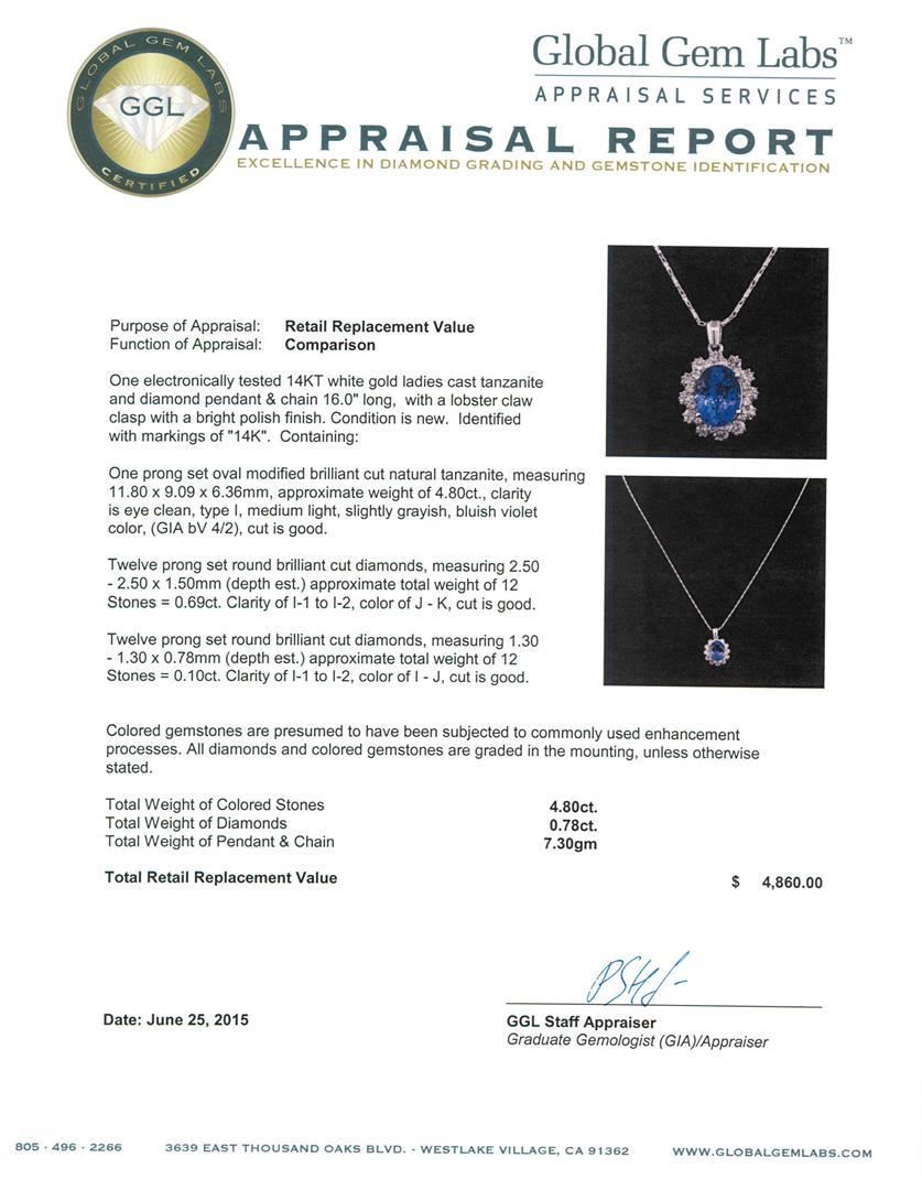 One electronically tested 14KT white gold ladies cast tanzanite and diamond pendant & chain 16.0" long, with a lobster claw clasp with a bright polish finish. Identified with markings of "14K". Condition is new. Containing: One prong set oval modified brilliant cut natural tanzanite, measuring 11.80 x 9.09 x 6.36mm, approximate weight of 4.80 ct., clarity is eye clean, type I, medium light, slightly grayish, bluish violet color, (GIA bV 4/2), cut is good. Twelve prong set round brilliant cut diamonds, measuring 2.50 - 2.50 x 1.50mm (depth est.) approximate. Total Weight of 12 Stones = 0.69ct. Clarity: I-1 to I-2. Color: J - K, Cut is Good. Twelve prong set round brilliant cut diamonds, measuring 1.30 - 1.30 x 0.78mm (depth est.) approximate. Total Weight of 12 Stones = 0.10 ct. Clarity: I-1 to I-2. Color: I - J, Cut is Good. Colored gemstones are presumed to have been subjected to commonly used enhancement processes. All diamonds and colored gemstones are graded in the mounting, unless otherwise stated. Total Weight of Colored Stones 4.80 ct. Total Weight of Diamonds 0.78ct. Total Weight of Pendant & Chain 7.30 grams. GGL Appraised.