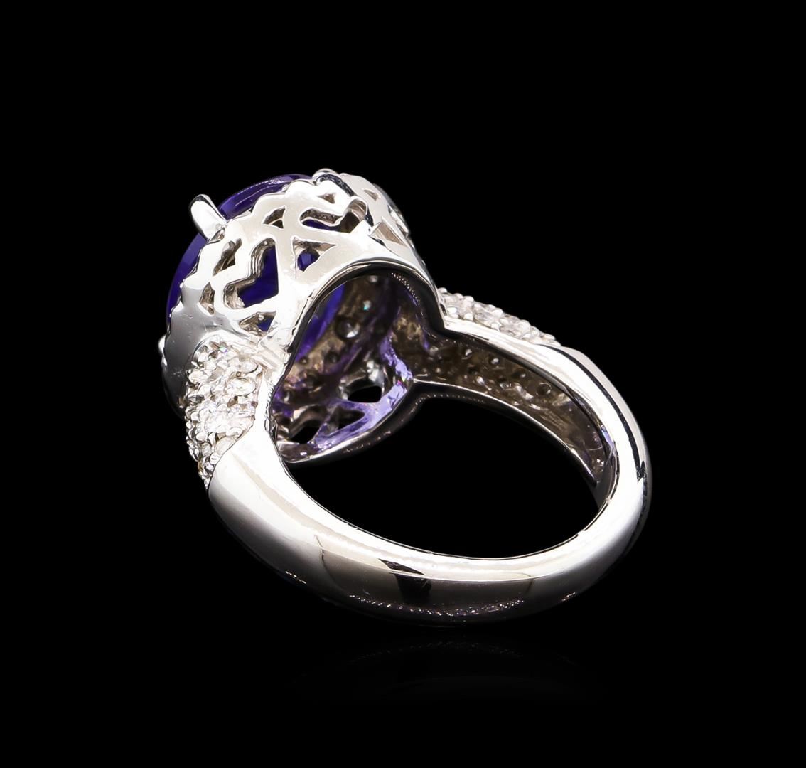 One electronically tested 14KT white gold lady's cast fashion ring with a half round shank with a bright polish finish. The featured lady's ring has a shank measuring 3.82 millimeters wide. Condition is new, good workmanship. Containing: One prong set oval modified brilliant cut natural tanzanite, measuring 12.60 x 9.45 x 5.84mm, approximate weight of 4.80ct., clarity is eye clean, type I, medium dark, moderately strong, violetish blue color, (GIA vB 6/4), cut is very good. Transmitting light with no distortion, transparent. Colored gemstones are presumed to have been subjected to commonly used enhancement processes. Graded in the setting. Sixty-Six prong set round brilliant cut diamonds, measuring 1.55 - 1.45 x 0.93mm (depth est.) approximate total weight of 66 Stones = 0.85ct. Graded in the setting. Clarity: SI-1 to I-1. Color: H - I. Cut Good. Total Weight of Colored Stones 4.80ct. Total Weight of Diamonds 0.85ct. Total Weight of Ring 9.30gm. GAS Appraised at $11,935.00.