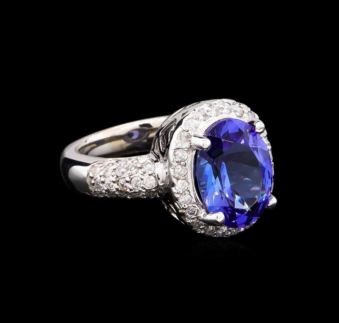 One electronically tested 14KT white gold lady's cast fashion ring with a half round shank with a bright polish finish. The featured lady's ring has a shank measuring 3.82 millimeters wide. Condition is new, good workmanship. Containing: One prong set oval modified brilliant cut natural tanzanite, measuring 12.60 x 9.45 x 5.84mm, approximate weight of 4.80ct., clarity is eye clean, type I, medium dark, moderately strong, violetish blue color, (GIA vB 6/4), cut is very good. Transmitting light with no distortion, transparent. Colored gemstones are presumed to have been subjected to commonly used enhancement processes. Graded in the setting. Sixty-Six prong set round brilliant cut diamonds, measuring 1.55 - 1.45 x 0.93mm (depth est.) approximate total weight of 66 Stones = 0.85ct. Graded in the setting. Clarity: SI-1 to I-1. Color: H - I. Cut Good. Total Weight of Colored Stones 4.80ct. Total Weight of Diamonds 0.85ct. Total Weight of Ring 9.30gm. GAS Appraised at $11,935.00.