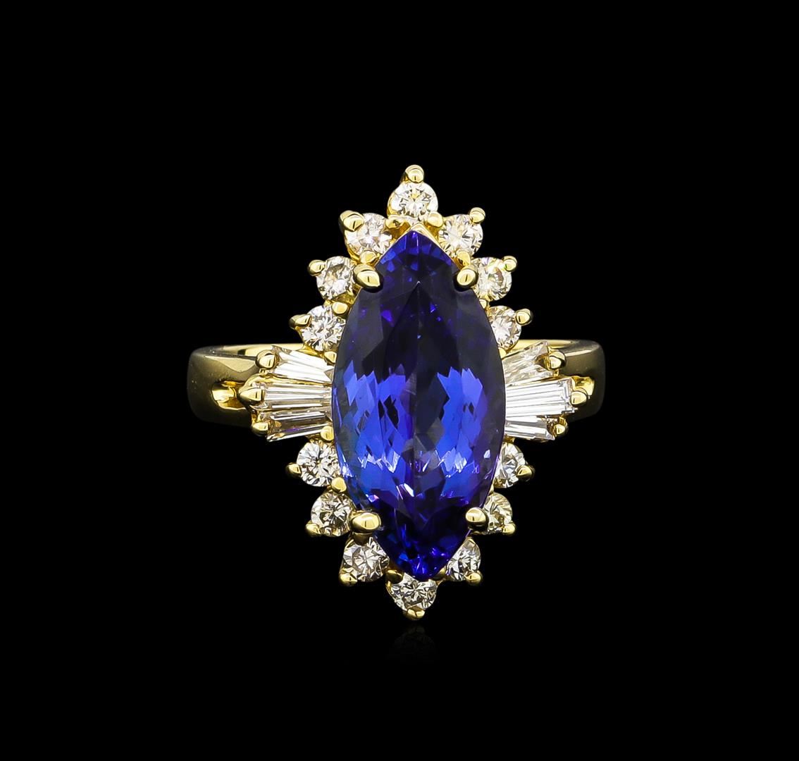 One electronically tested 14KT yellow gold ladies cast tanzanite & diamond ring with a bright polish finish. Condition is new, good workmanship. The featured tanzanite is set within a bezel of diamonds accented by baguette diamonds, completed by a three millimeter wide band. Identified with markings of "14K". Containing: One prong set marquise mixed cut natural tanzanite, measuring 15.80 x 7.70 x 5.70mm, 5% bulge factor, approximate weight of 4.80ct., clarity is eye clean, type I, medium, very slightly grayish, violetish blue color, (GIA vB 5/3), cut is good. Transmitting light with no distortion, transparent. Graded in the setting. Tanzanite is a very rare gemstone that is only found in the country of Tanzania. Tanzanite was originally discovered in 1967. Tiffany & Company, named the stone "Tanzanite" after the country of origin. Tanzanite is found in the Usumburu Mountains that border the Umba Valley of northern Tanzania. This region is inhabited by the Masai tribes-people. The mining area is located just south of the Kenya border near Mt. Kilimanjaro. Tanzanite occurs in colors of gray, brown, violet, blue, reddish-purple, & green. The gem is interesting because of its exceptional pleochroism. Rotated in different directions a tanzanite will exhibit multiple changes of color. Tanzanite has a low tolerance to ultrasonic cleaning, and should not be cleaned using this method. Fourteen prong set round brilliant cut diamonds, measuring 2.10 - 2.00 x 1.23mm (depth est.) approximate total weight of 14 Stones = 0.49ct. Graded in the setting. Six prong set baguette cut diamonds, measuring from 3.20 x 1.20 x 0.84mm (depth est.) to 4.00 x 1.20 x 0.84mm (depth est.) approximate total weight of 6 Stones = 0.25ct. Graded in the setting. Clarity: VS-2 to SI-2. Color: H -I. AIG Appraised at $15,000.00.