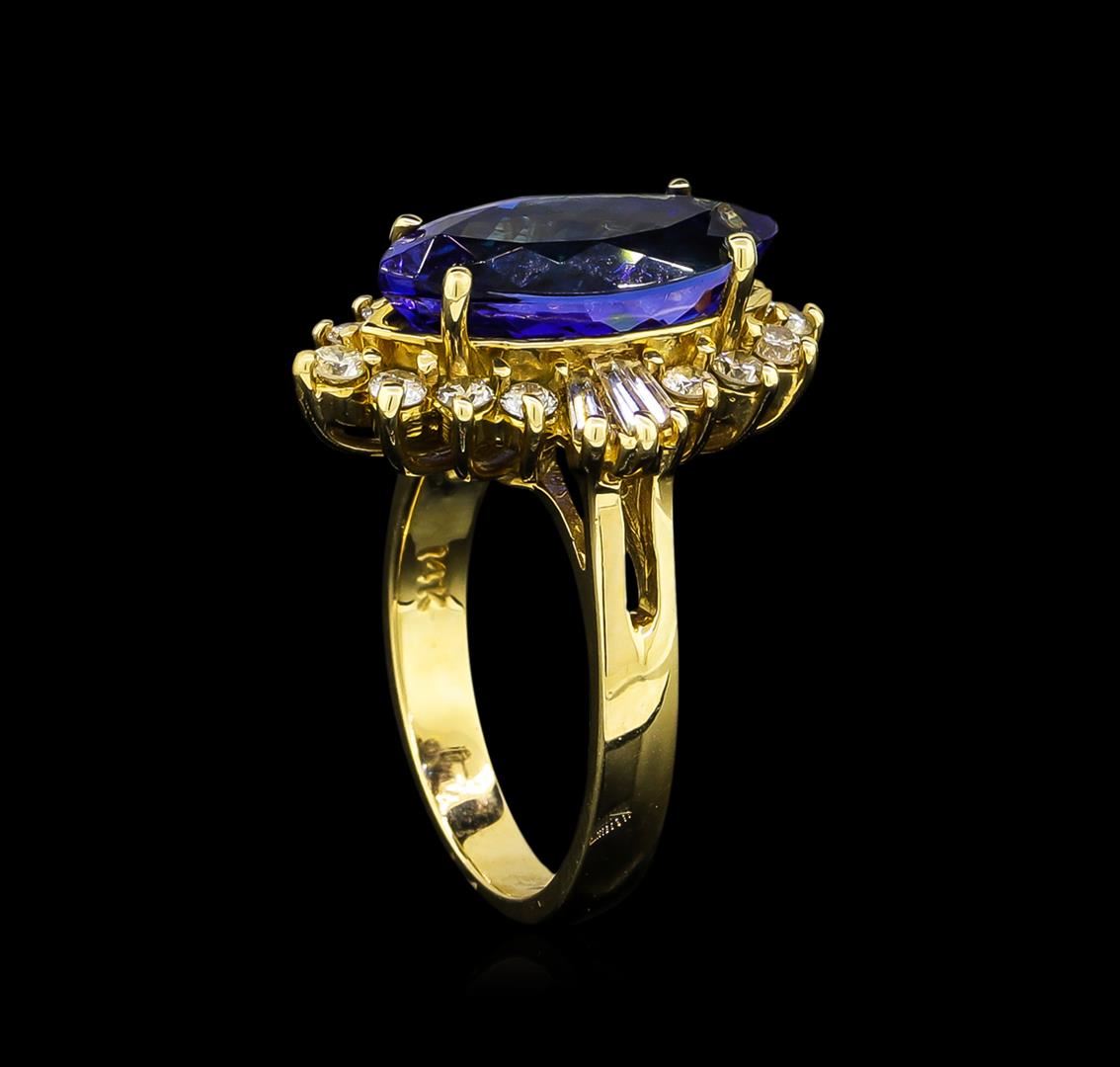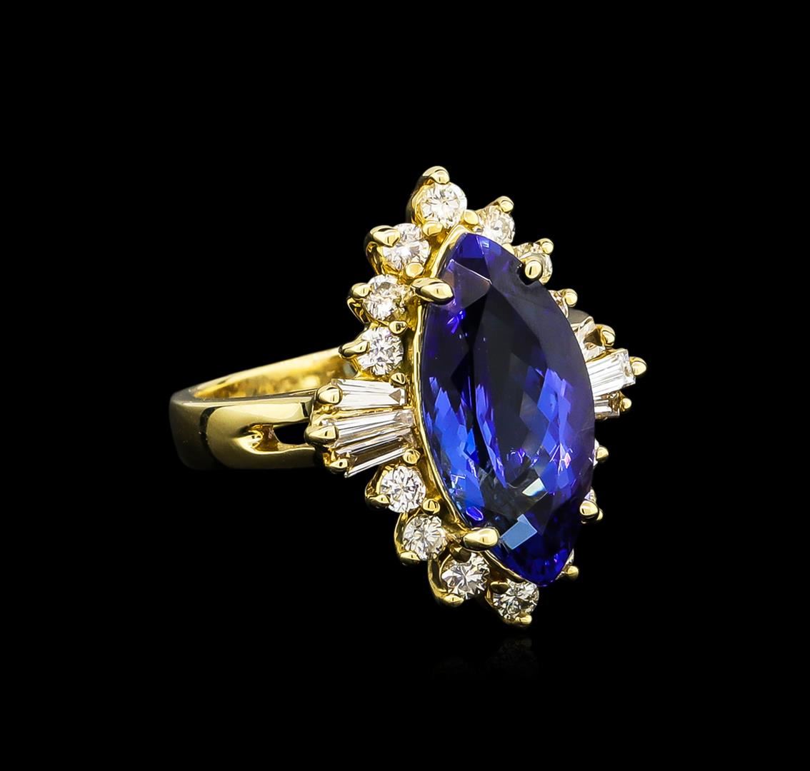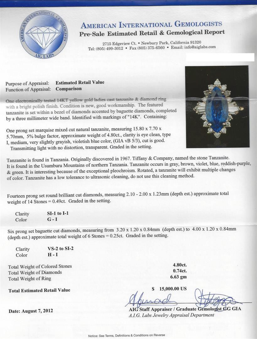 One electronically tested 14KT yellow gold ladies cast tanzanite & diamond ring with a bright polish finish. Condition is new, good workmanship. The featured tanzanite is set within a bezel of diamonds accented by baguette diamonds, completed by a three millimeter wide band. Identified with markings of "14K". Containing: One prong set marquise mixed cut natural tanzanite, measuring 15.80 x 7.70 x 5.70mm, 5% bulge factor, approximate weight of 4.80ct., clarity is eye clean, type I, medium, very slightly grayish, violetish blue color, (GIA vB 5/3), cut is good. Transmitting light with no distortion, transparent. Graded in the setting. Tanzanite is a very rare gemstone that is only found in the country of Tanzania. Tanzanite was originally discovered in 1967. Tiffany & Company, named the stone "Tanzanite" after the country of origin. Tanzanite is found in the Usumburu Mountains that border the Umba Valley of northern Tanzania. This region is inhabited by the Masai tribes-people. The mining area is located just south of the Kenya border near Mt. Kilimanjaro. Tanzanite occurs in colors of gray, brown, violet, blue, reddish-purple, & green. The gem is interesting because of its exceptional pleochroism. Rotated in different directions a tanzanite will exhibit multiple changes of color. Tanzanite has a low tolerance to ultrasonic cleaning, and should not be cleaned using this method. Fourteen prong set round brilliant cut diamonds, measuring 2.10 - 2.00 x 1.23mm (depth est.) approximate total weight of 14 Stones = 0.49ct. Graded in the setting. Six prong set baguette cut diamonds, measuring from 3.20 x 1.20 x 0.84mm (depth est.) to 4.00 x 1.20 x 0.84mm (depth est.) approximate total weight of 6 Stones = 0.25ct. Graded in the setting. Clarity: VS-2 to SI-2. Color: H -I. AIG Appraised at $15,000.00.