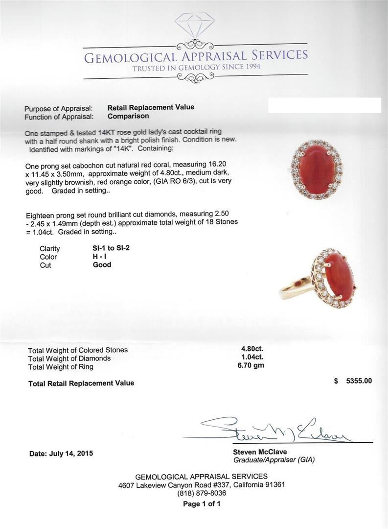 One stamped & tested 14KT rose gold lady's cast cocktail ring with a half round shank with a bright polish finish. Condition is new. Identified with markings of "14K". Containing: One prong set cabochon cut natural red coral, measuring 16.20 x 11.45 x 3.50mm, approximate weight of 4.80ct., medium dark, very slightly brownish, red orange color, (GIA RO 6/3), cut is very good. Graded in setting. Eighteen prong set round brilliant cut diamonds, measuring 2.50 - 2.45 x 1.49mm (depth est.) approximate total weight of 18 Stones = 1.04ct. Graded in setting. Clarity: SI-1 to SI-2. Color: H - I. Cut: Good. Total Weight of Colored Stones: 4.80ct. Total Weight of Diamonds: 1.04ct. Total Weight of Ring: 6.70 gm. GAS Appraised at $5,355.00.