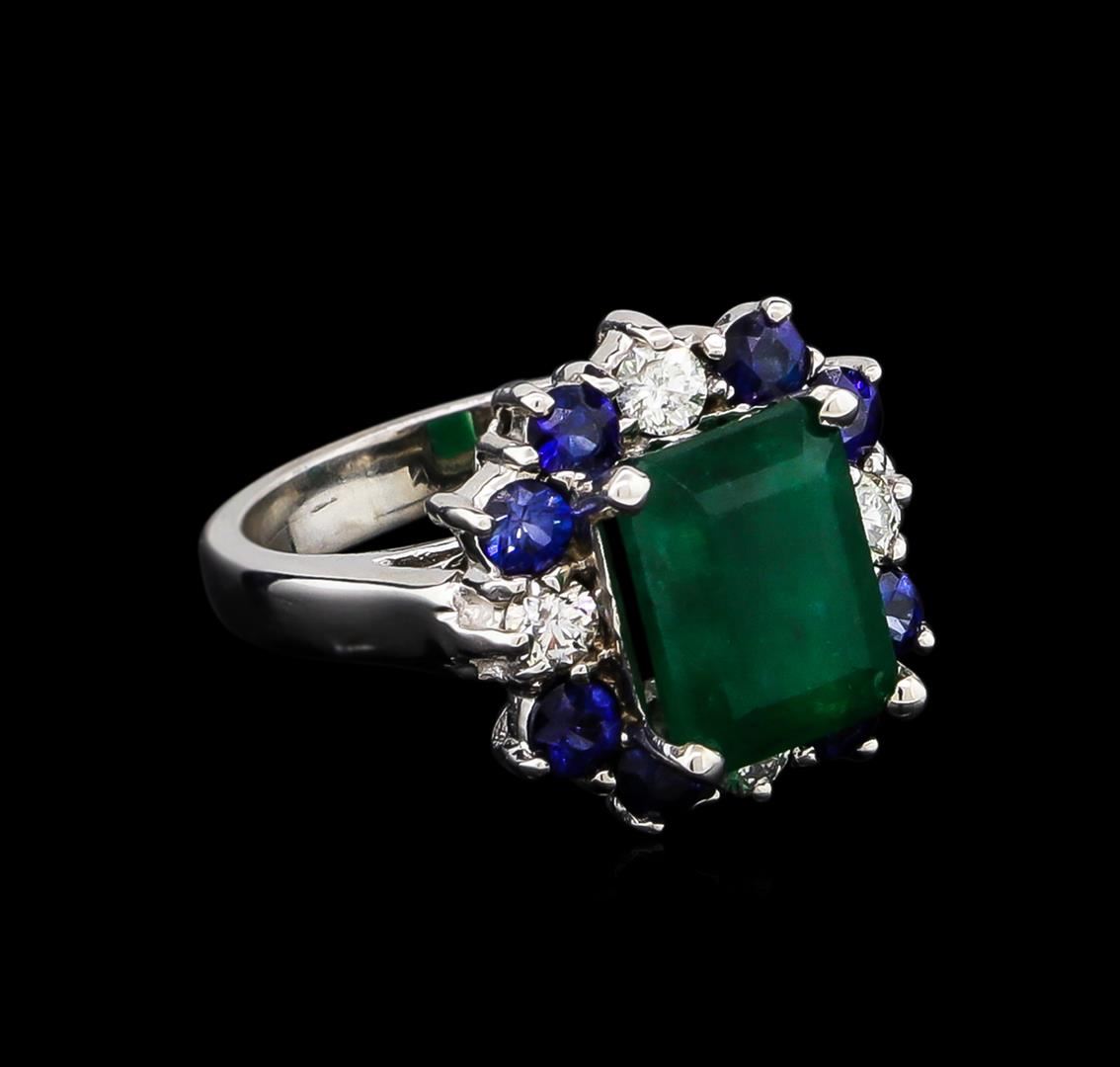 One electronically tested 14KT white gold lady's cast fashion ring with a basket halo with a bright polish finish. The featured lady's ring has a shank measuring 3.17 millimeters wide. Identified with markings of "14K". Condition is new, good workmanship. Containing: One prong set emerald step cut natural emerald, measuring 9.99 x 7.37 x 6.26mm, 10%. bulge factor, approximate weight of 3.85ct., clarity is heavily included, type III, medium dark, moderately strong, green color, (GIA G 6/4), cut is good. Transmitting light somewhat diffusely, semi-transparent to translucent. Indications of oil residue. Naturally occurring internal & external characteristics are present. Graded in the setting. Eight prong set round modified brilliant cut natural blue sapphires, measuring 2.90 - 2.80 x 1.85 mm, approximate total weight of 0.96ct., clarity is slightly included, type II, medium, moderately strong, blue color, (GIA B 5/4), cut is good. Colored gemstones are presumed to have been subjected to commonly used enhancement processes. Graded in the setting. Four prong set round brilliant cut diamonds, measuring 2.80 - 2.75 x 1.75mm (depth est.) approximate total weight of 4 Stones = 0.36ct. Graded in the setting. Clarity: SI-1 to SI-2. Color: H - I. Cut Very Good. Total Weight of Colored Stones 4.81ct. Total Weight of Diamonds 0.36ct. Total Weight of Ring 7.20gm. GAS Appraised at $6,385.00.
