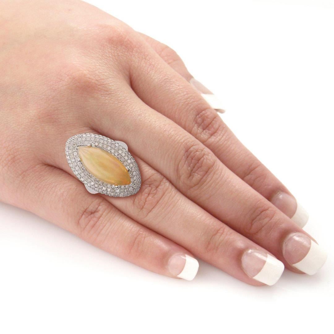 One electronically tested 14KT white gold ladies cast opal and diamond ring with a bright polish finish. Condition is new, good workmanship. The featured opal cabochon is set in a tiered diamond bezel supported by tapered shoulders, completed by a two millimeter wide band. Trademark is Orianne. Identified with markings of "14K". Containing: One semi crystal opal that is cut in a marquise shaped cabochon and is prong set, measuring 20.30 mm long x 9.10 mm wide, and 5.50 mm thick and the approximate weight is 4.81 carats. The opal has a somewhat bright, multicolor play of color (fire) in a flashfire pattern; a medium dome; a good cut; ; minor dull spot in its brightness and pattern; and is slightly directional. Graded in the setting. One hundred seventy-one prong set round brilliant cut diamonds, measuring 1.30 - 1.30 x 0.85mm (depth est.) approximate total weight of 171 Stones = 1.59ct. Graded in the setting. Clarity I-2 to I-3 Color G - I Total Weight of Diamonds 1.59ct. Total Weight of Opals 4.81ct. Total Weight of Ring 7.97 gm #Size: 7