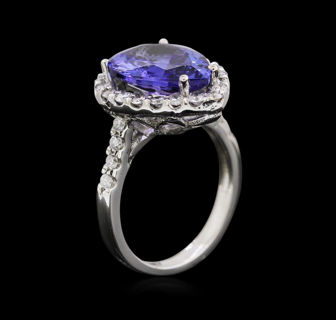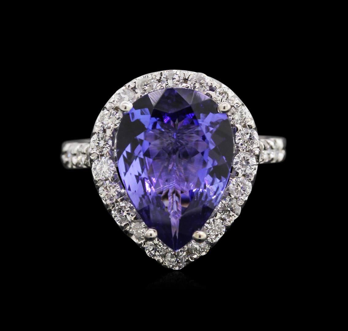 One electronically tested 14KT white gold lady's cast fashion ring with a halo with a bright polish finish. The featured lady's ring has a shank measuring 2.30 millimeters wide. Identified with markings of "14K". Condition is new, good workmanship. Containing: One prong set pear modified brilliant cut natural tanzanite, measuring 14.00 x 10.03 x 5.11mm, approximate weight of 4.81ct., clarity is eye clean, type I, medium dark, very slightly grayish, bluish violet color, (GIA bV 6/3), cut is good. Transmitting light with no distortion, transparent. Colored gemstones are presumed to have been subjected to commonly used enhancement processes. Graded in the setting. Twenty-Eight prong set round brilliant cut diamonds, measuring 2.00 - 1.90 x 1.19mm (depth est.) approximate total weight of 28 Stones = 0.77ct. Graded in the setting. Clarity: SI-2 to I-1. Color: H - I. Cut Good. Total Weight of Colored Stones 4.81ct. Total Weight of Diamonds 0.77ct. Total Weight of Ring 5.60gm. GAS Appraised at $8,735.00.