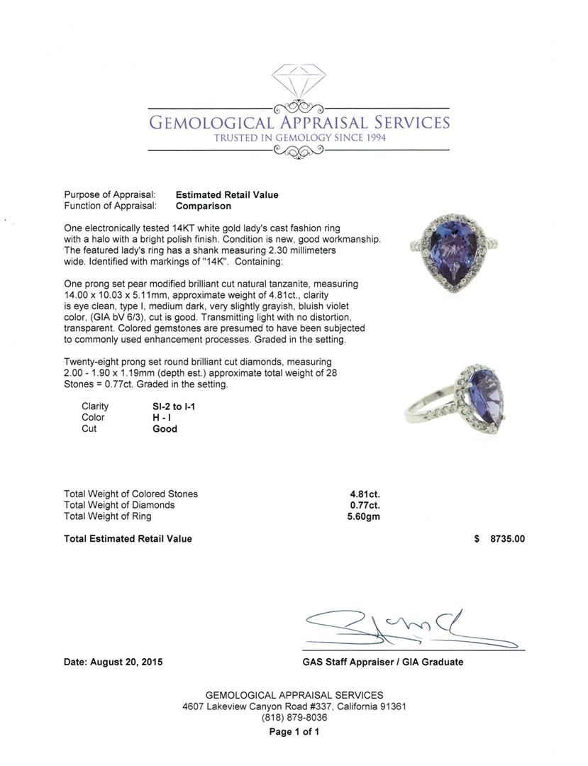 One electronically tested 14KT white gold lady's cast fashion ring with a halo with a bright polish finish. The featured lady's ring has a shank measuring 2.30 millimeters wide. Identified with markings of "14K". Condition is new, good workmanship. Containing: One prong set pear modified brilliant cut natural tanzanite, measuring 14.00 x 10.03 x 5.11mm, approximate weight of 4.81ct., clarity is eye clean, type I, medium dark, very slightly grayish, bluish violet color, (GIA bV 6/3), cut is good. Transmitting light with no distortion, transparent. Colored gemstones are presumed to have been subjected to commonly used enhancement processes. Graded in the setting. Twenty-Eight prong set round brilliant cut diamonds, measuring 2.00 - 1.90 x 1.19mm (depth est.) approximate total weight of 28 Stones = 0.77ct. Graded in the setting. Clarity: SI-2 to I-1. Color: H - I. Cut Good. Total Weight of Colored Stones 4.81ct. Total Weight of Diamonds 0.77ct. Total Weight of Ring 5.60gm. GAS Appraised at $8,735.00.